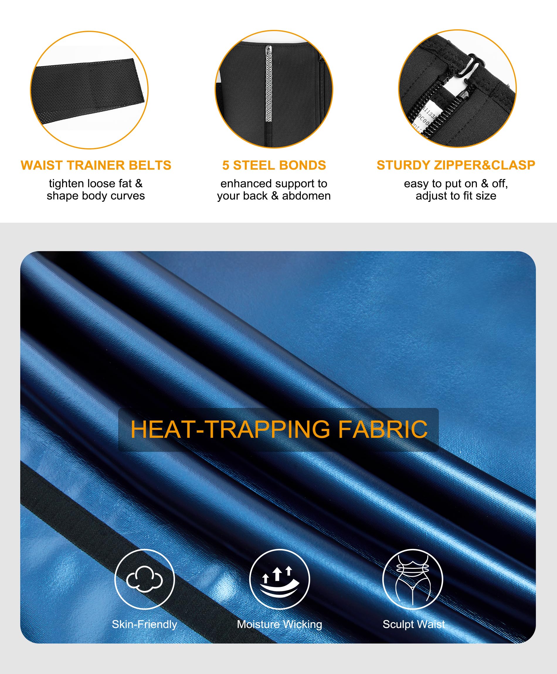 - DOUBLE COMPRESSION FOR WAIST TRAINER. Hot sweat body shaper wraps add 2 waist girdles, which more fits our waist and abdomen so that tighten and strengthen our abdominal core muscles and adjust sizes and tightness according to different waistline for ensuring that people of different weight can wear. The heat trapping polyester fabric and zipper locks our body heat, increases sweating and protects the abdominal skin during sports.
