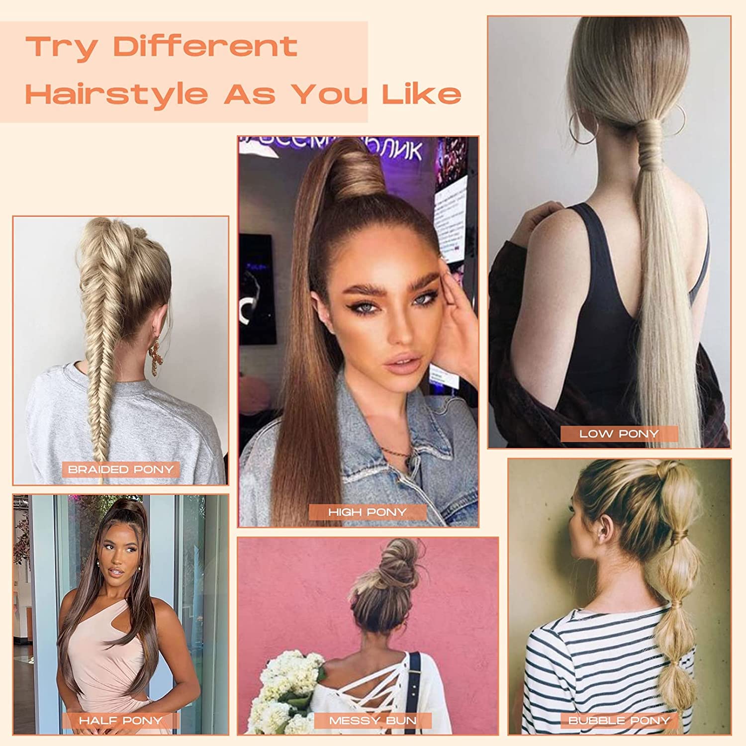 - ❤️Easy to use: The clip in ponytail hair extensions features five combs securely fastening the ponytail. Just insert the clip above the hair tie, wrap your hair with the wide soft weft, and use bobby pins if needed to secure