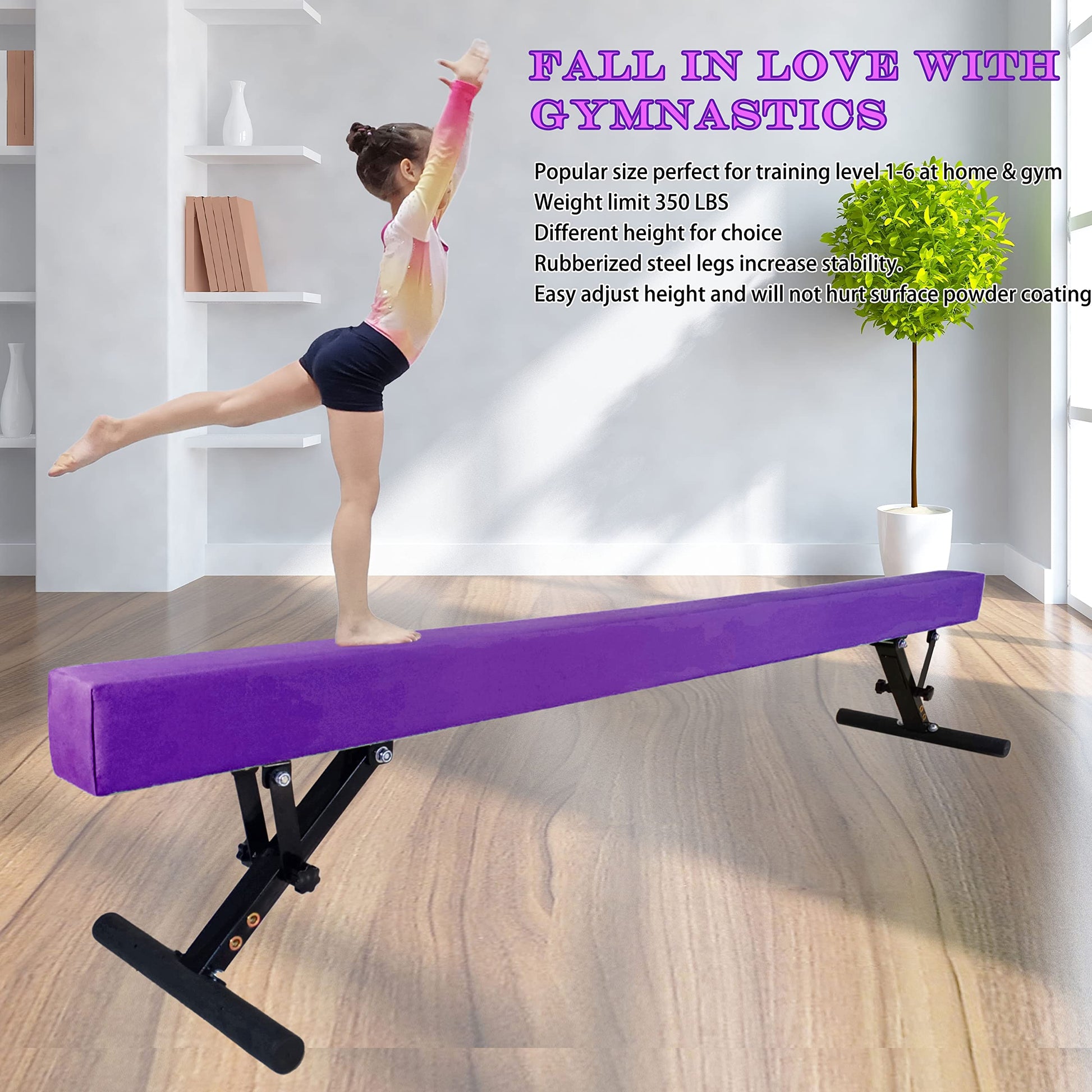 - Stable Structure: The Gymnastic beam features FOUR POINTS of support on the beam, a triangle stable structure for the legs. Support a weight limit of 350 LBS. The 360° Rubber covered base legs enhance stability, improving the equipment for gymnasts training at home, even for advanced levels
