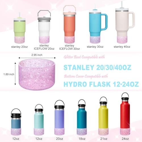 - [Glitter Bottom Boot for Stanley Cup] Silicone boot, bottom cover in nice color, looks cute and snugly fits your stanley 40 oz 30oz 20oz tumbler. Bottom boots glittered surface, making your Stanley cup more attractive. Vivid clear boot color shows the bottom color of your Stanley cup, boott accessories not only as bottom protector for tumblers, also making your Stanley cup to be shiny and unique.