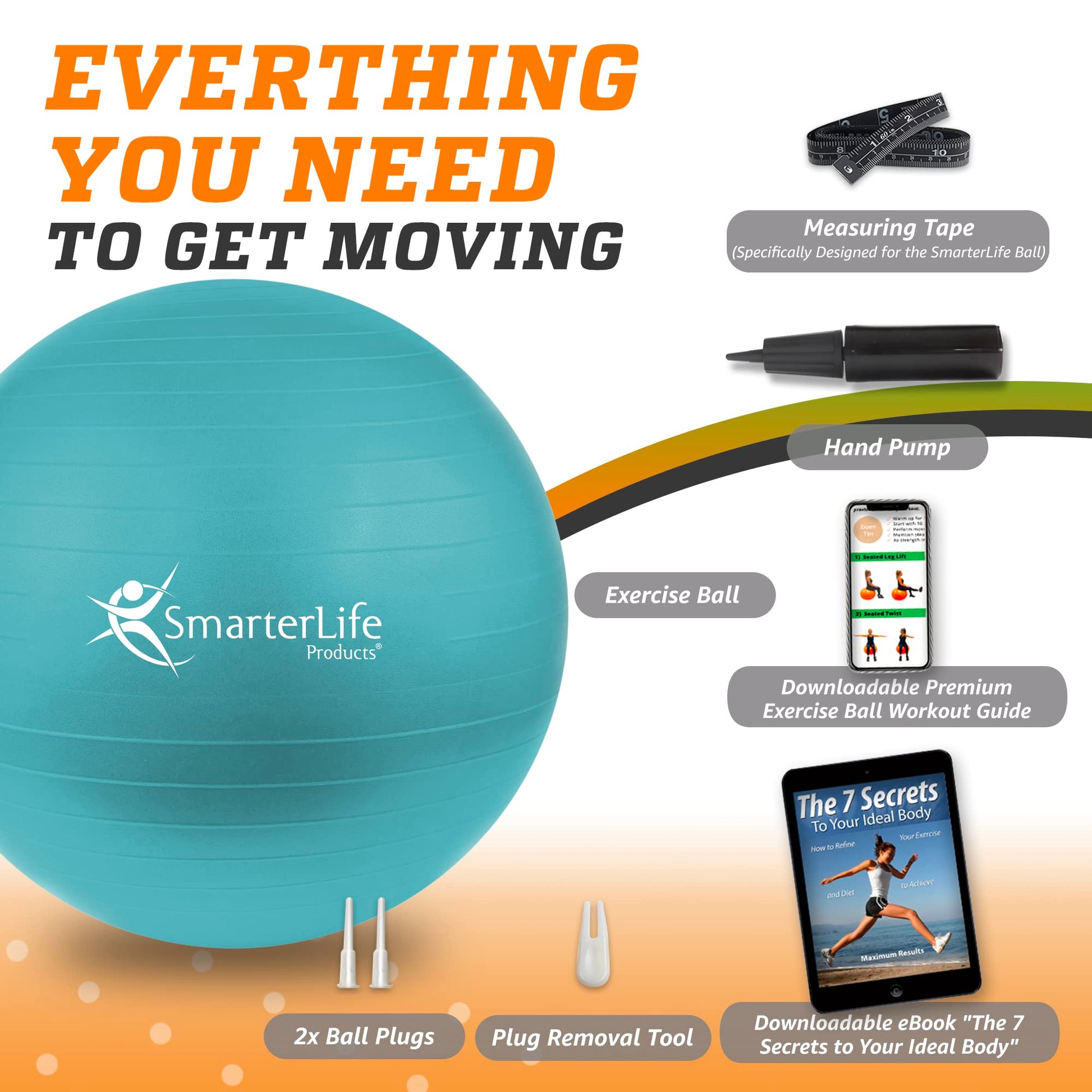 - WHAT'S INCLUDED: We include the exercise sitting ball, an exercise ball pump, inflation measuring tape, two (2) ball plugs with a removal tool, an exclusive downloadable complete body workout guide, and a downloadable eBook called 'The 7 Secrets to Your Ideal Body.' Also downloadable is our āPremium Exercise Ball Workout Guideā which picks up where the included-in-the-box āQuickStart Exercise Guideā leaves off. The download instructions are included in a sheet in the box.