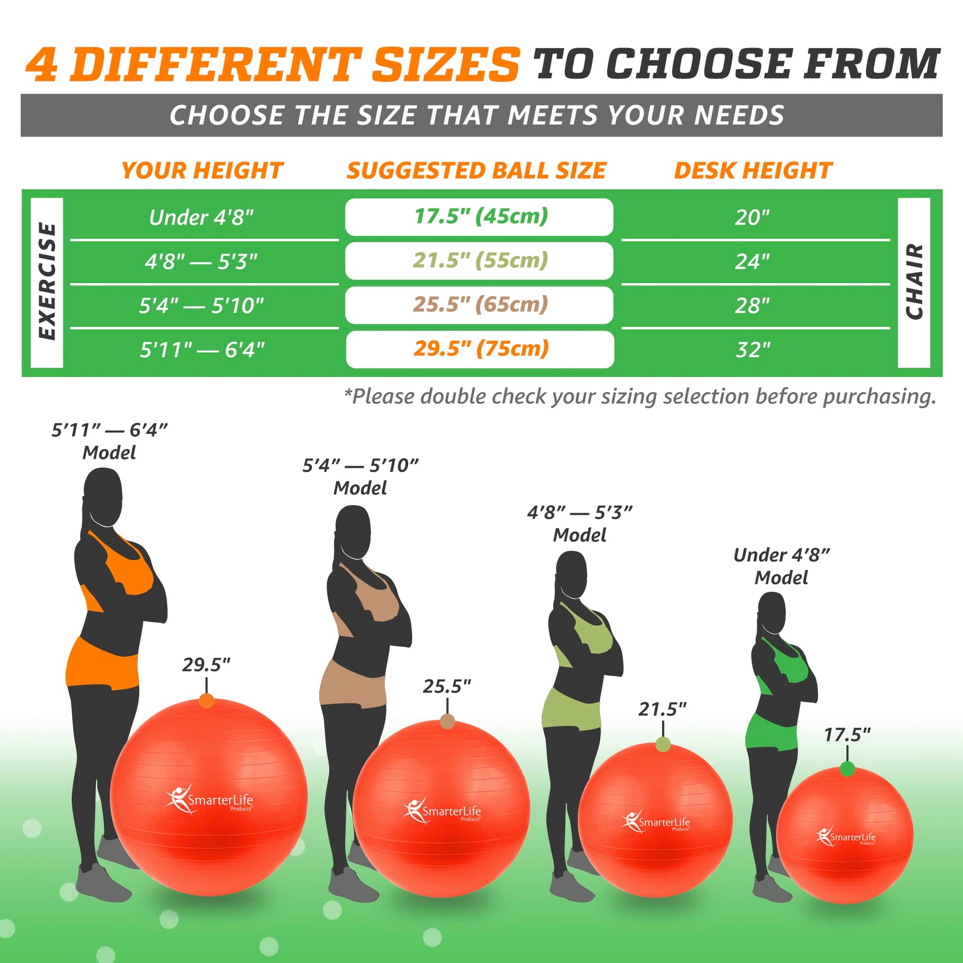 - THE RIGHT SIZE FOR YOU: We offer a choice of 45 cm, 55 cm, 65 cm, and 75 cm sizes to suit your height so that you can easily and conveniently find the correctly sized work out ball to sit on or exercise with. Our sizing chart uses the userās height to help you select the correct size for workouts and uses desk height to help you select for use as a chair.