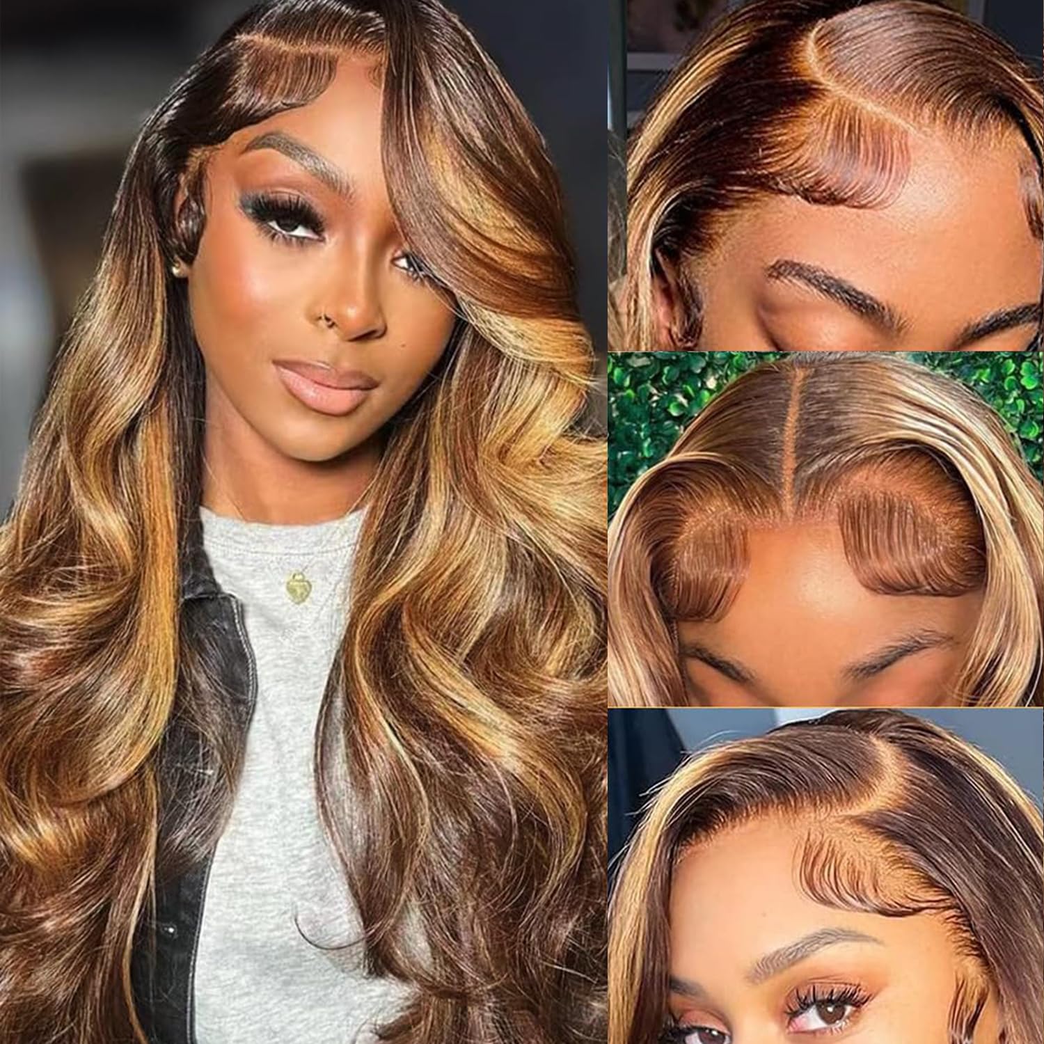 SPOU 13x6 Highlight Ombre Lace Frontal Wigs Human Hair 4/27 Honey Blonde 180% Density Body Wave Wig for Women HD Transparent Lace Front Wig with Highlights Colored Glueless Wigs Human Hair 24 Inch