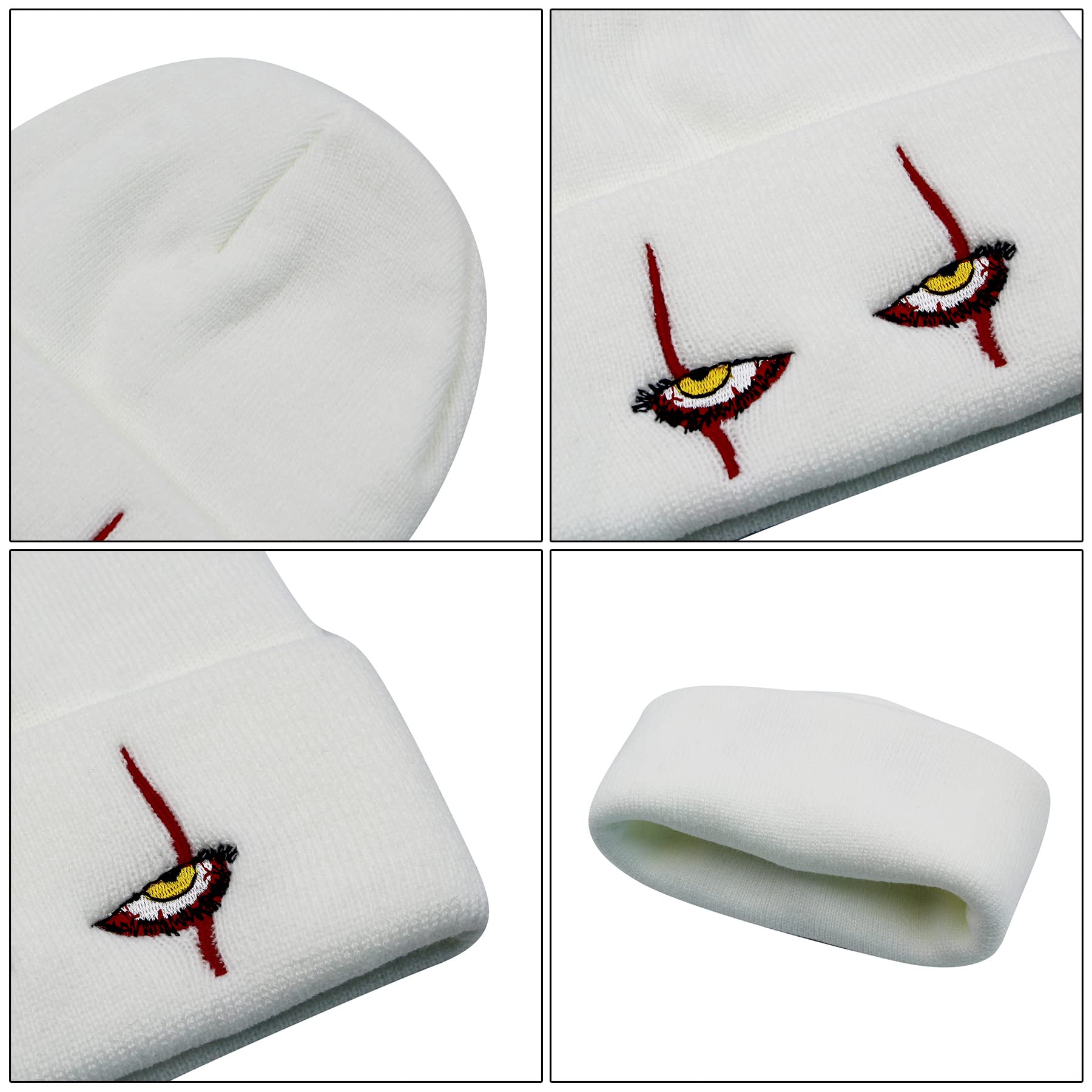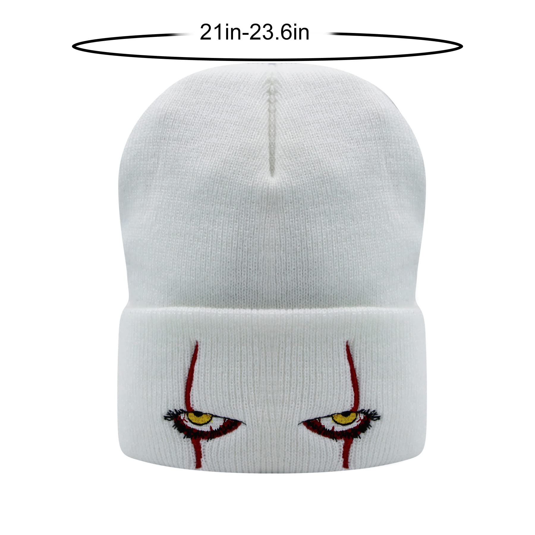 Suillty Unisex Winter Acrylic Knit Cuff Beanie Hat Clown Scary Eyes Embroidery Warm Winter Caps Halloween Hats for Adult Kids White