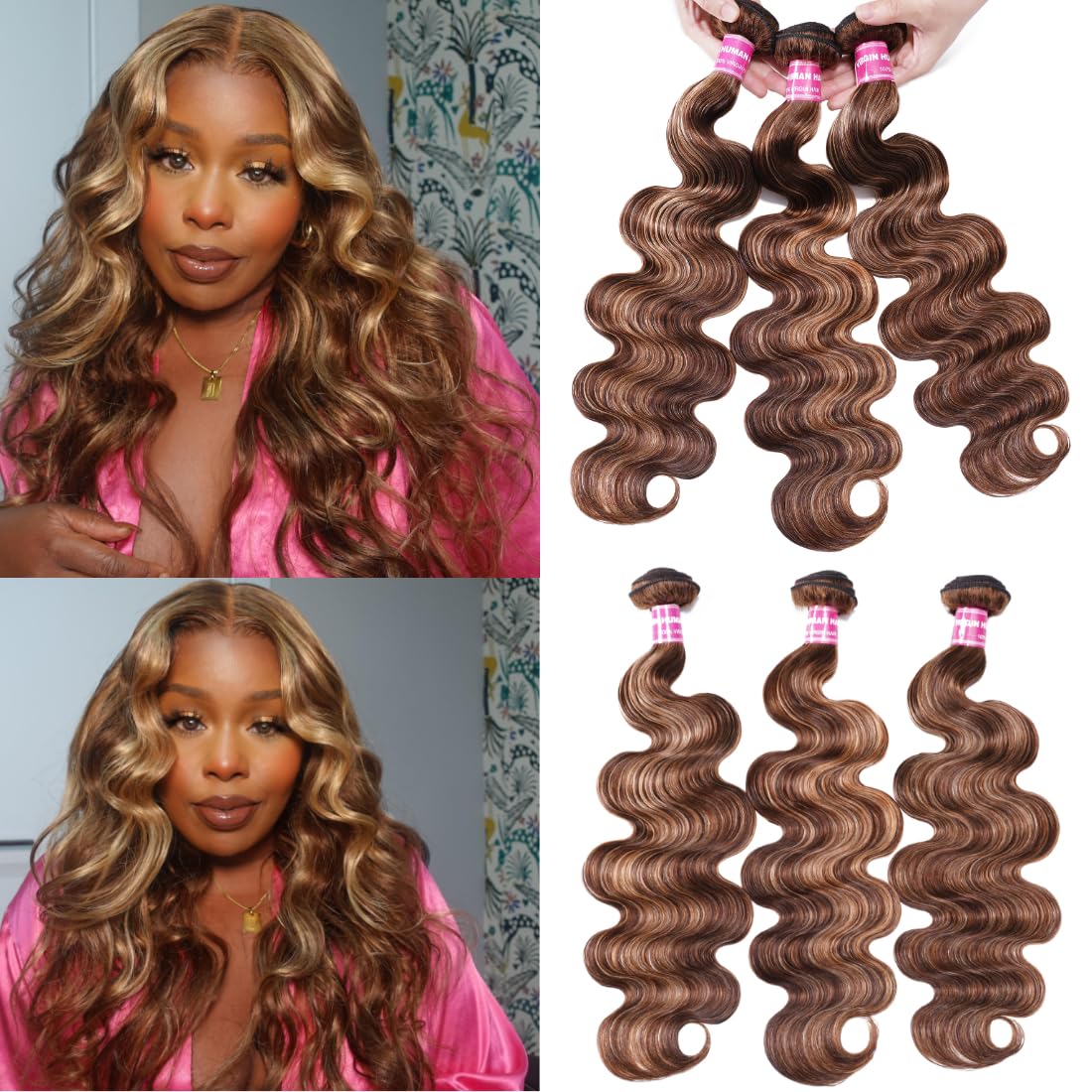 - Body wave human hair bundles Hair Color:Human hair bundles dark root blonde brown highlight color. Very beautiful and fashion suitable for summertime, trip beach and daily life to install.Can be heat, style the hair weave as you Want.