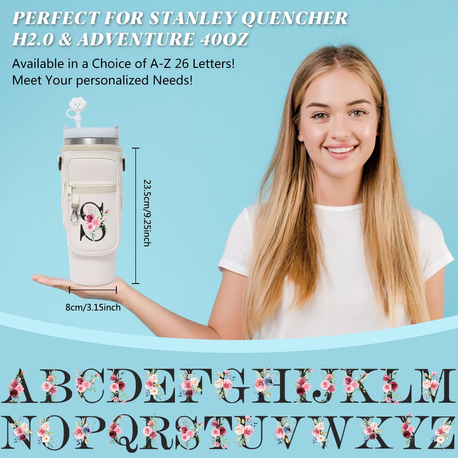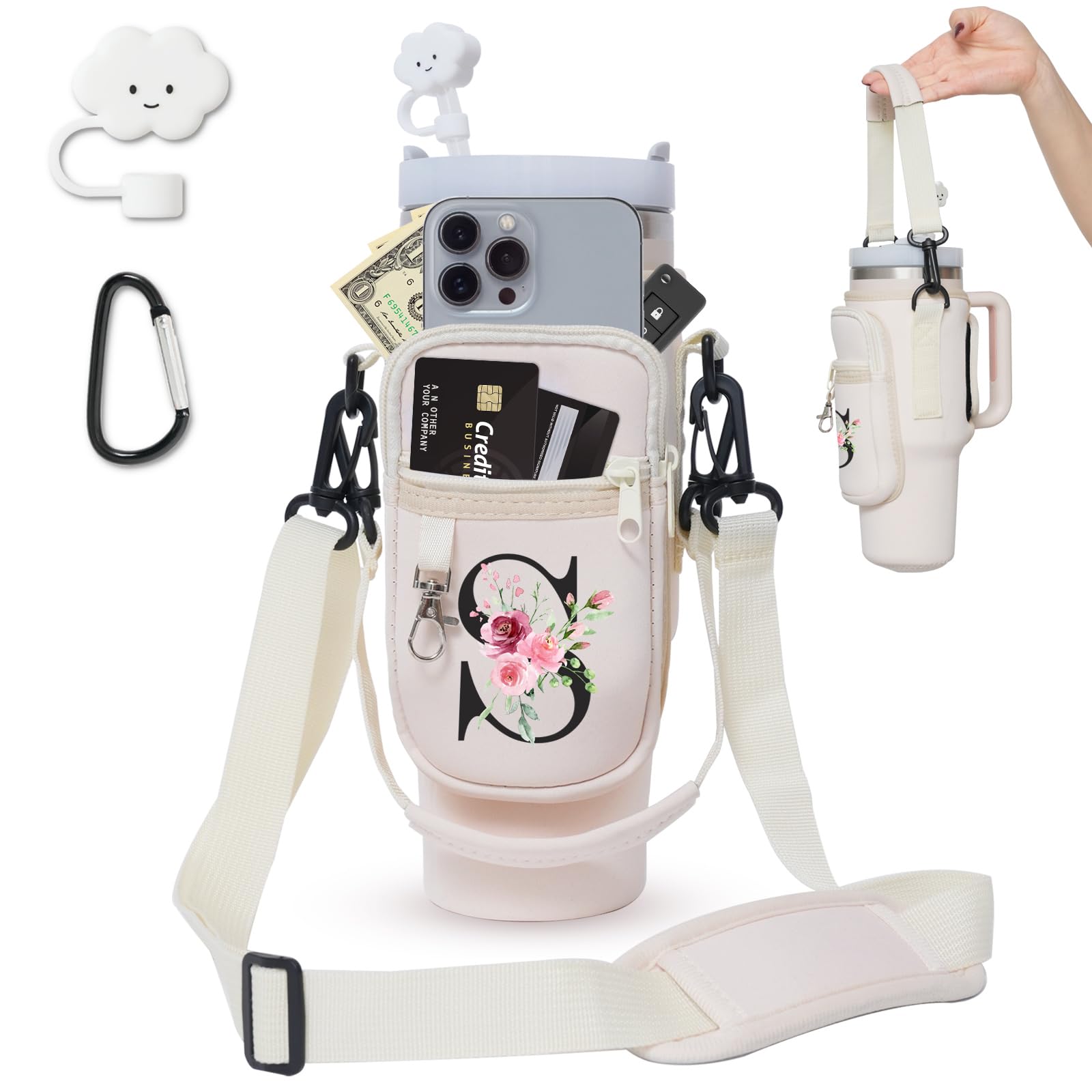 Sunegg Initial Water Bottle Carrier Bag for Stanley 40 oz Tumbler with Handle, Water Bottle Holder Pouch with Phone Pocket, Straw Cover & Carabiner, Nice Accessories for Stanley Cup(Cream S)