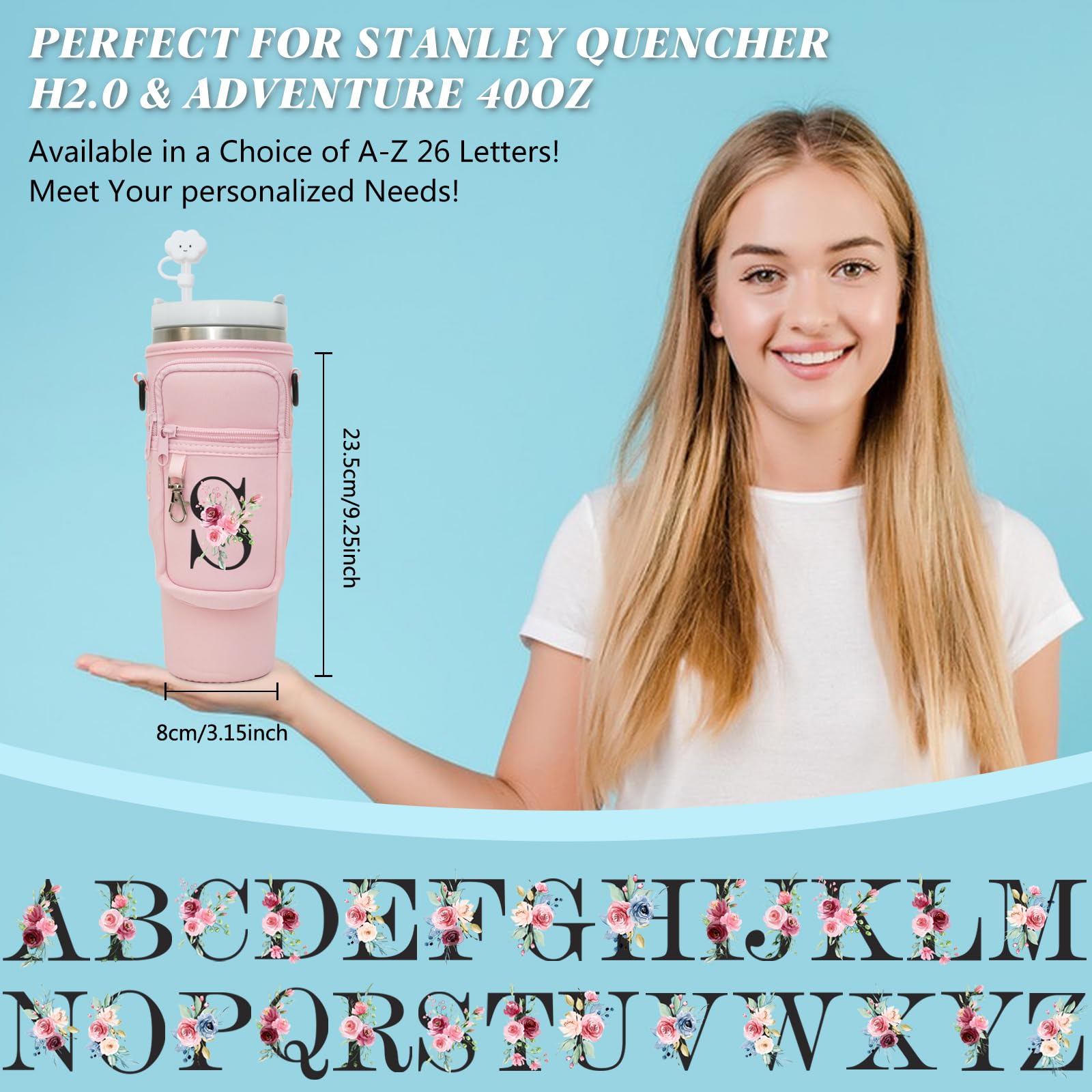 Sunegg Initial Water Bottle Carrier Bag for Stanley 40 oz Tumbler with Handle, Water Bottle Holder Pouch with Phone Pocket, Straw Cover & Carabiner, Nice Accessories for Stanley Cup(Pink S)