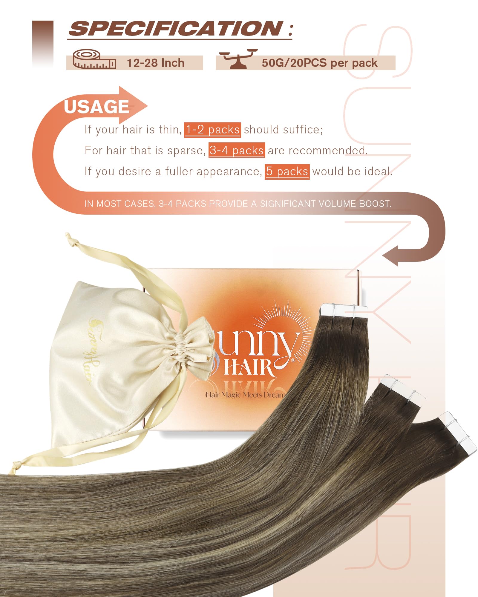 - 1.Say goodbye to bumps or lumps: Sunny tape in human hair extensions brown balayage are designed to be lightweight;won't add extra weight to your own hair, ensuring maximum comfort throughout the day and allowing for a natural and seamless look; Besides, they will be particularly suitable if your hair is fragile or thin;But not for people with very fine or breakage prone hair or people with sensitive scalp