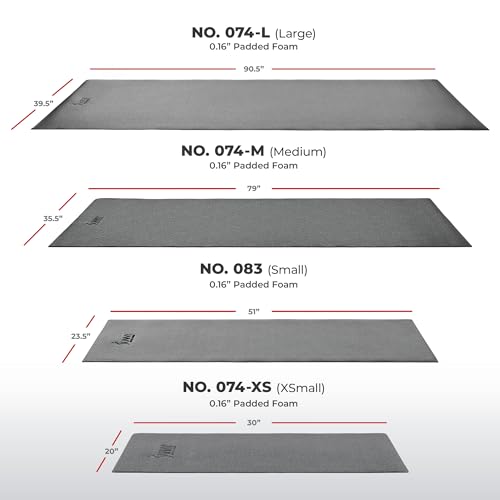 - 【VARIETY OF SIZES】 Our 4.2 mm thick mat comes in 4 sizes; easily fit any equipment of any size while keeping your room nice and tidy. EXTRA SMALL - 30 x 20 inches | SMALL - 51 x 23.5 inches | MEDIUM - 79 x 35.5 inches | LARGE - 90 x 39.5 inches.