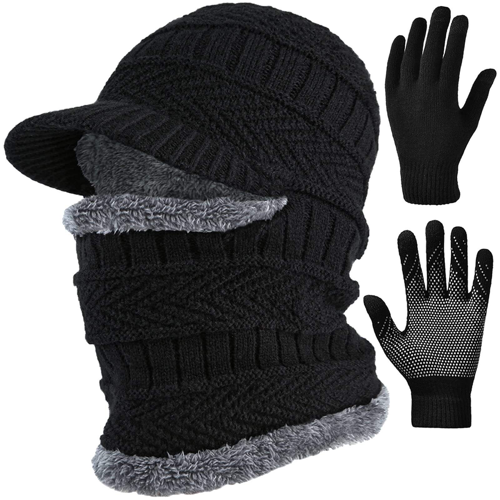 T WILKER 2Pcs Winter Knit Beanie Balaclava Hat Anti-Slip Touch Screen Mittens Set Thermal Ski Mask Cap Unisex for Womens Mens Black