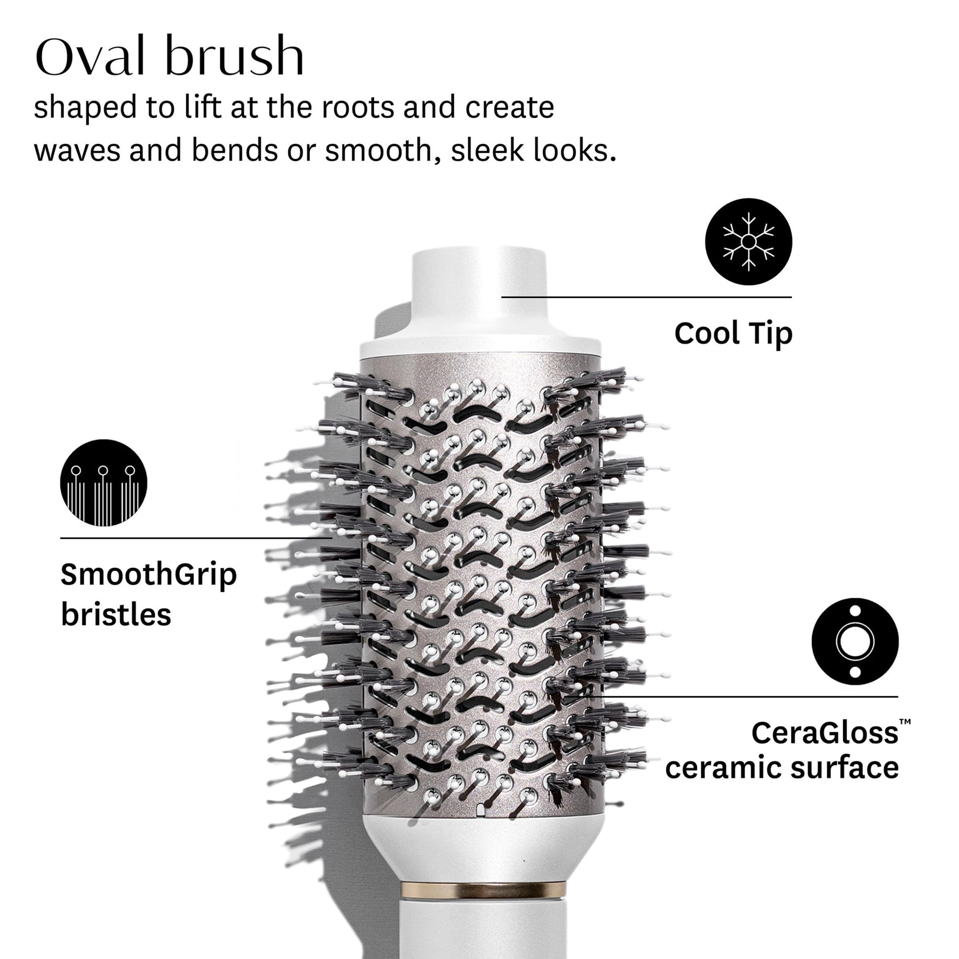 • Oval brush attachment is custom-designed with SmoothGrip bristles and a CeraGloss ceramic surface to lift, smooth, and boost shine