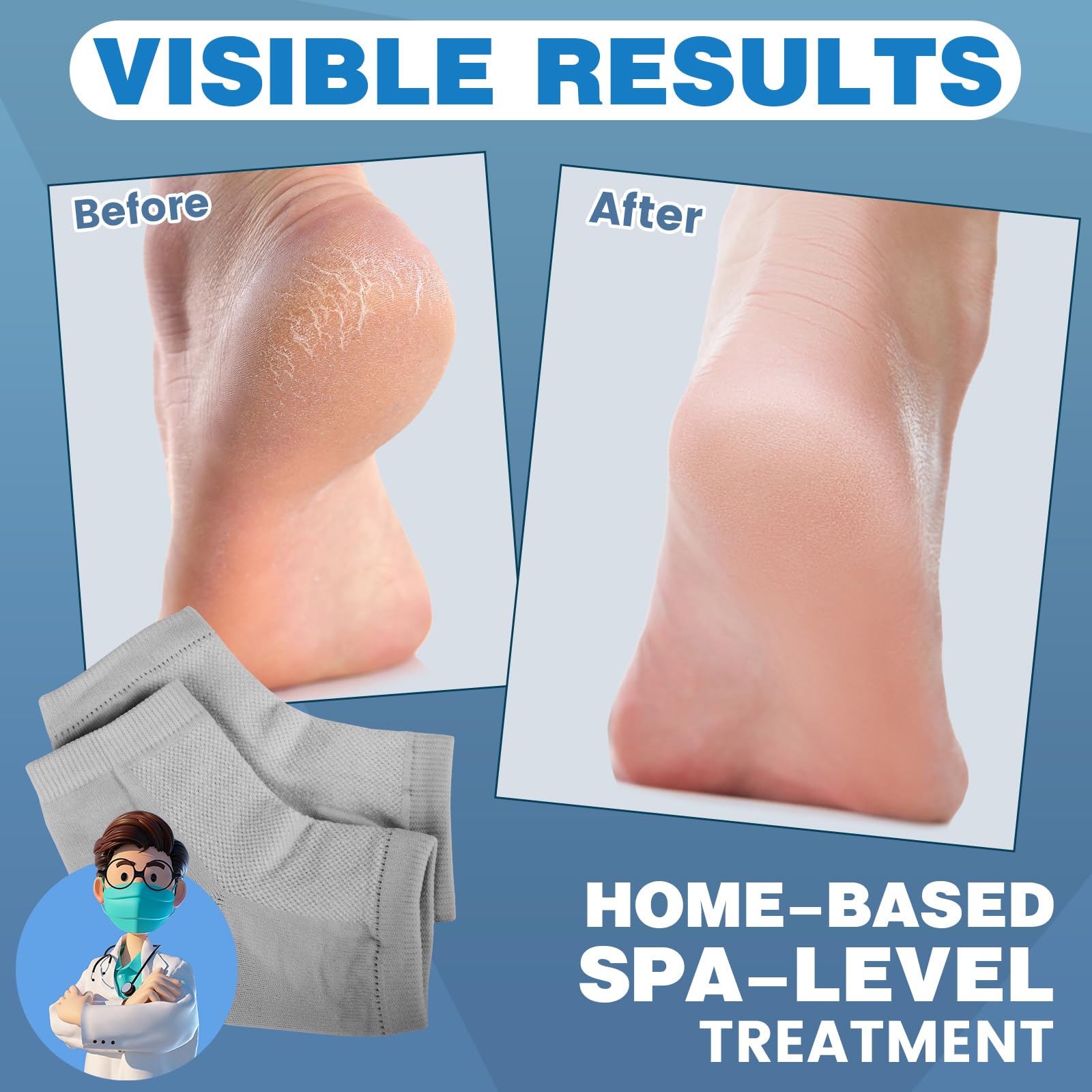 - 【DAY AND NIGHT TREATMENT FOR CRACKED HEELS】 The soothing moisturizing gel lining in our moisturizing heel socks is designed to lock in moisture and provide hydration to your dry heels day and night. For more damaged heels or faster results, we recommend the following ideal foot care routine: soak your feet, apply moisturizing lotion, wear the socks overnight, and continue using them. If you intend to wear the socks during the day, skip the moisturizer to avoid slippery heels.