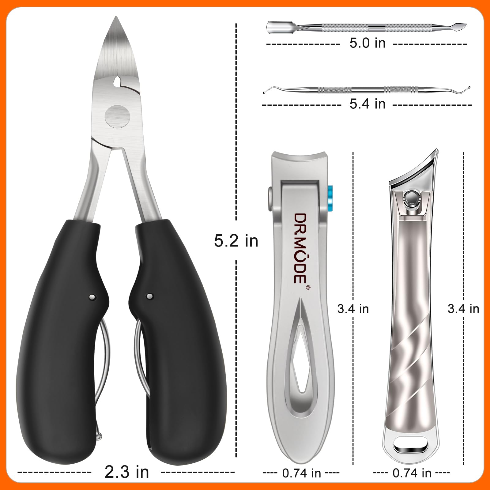 - PROFESSIONAL NAIL CLIPPER SET - DRMODE 5-IN-1 nail clipper set contains 1 x Large Podiatrist Toenail Clippers, 1 x Wide Jaw Opening Nail Clippers, 1 x Upgraded Slanted Nail Clippers, 1 x Ingrown Nail Lifter, 1 x Cuticle Pusher, packed in a beautiful box. Nail clippers for men are ideal for trimming thick nails, ingrown nails, big toenails, side nails and cuticles, great for seniors, men and women and adult.