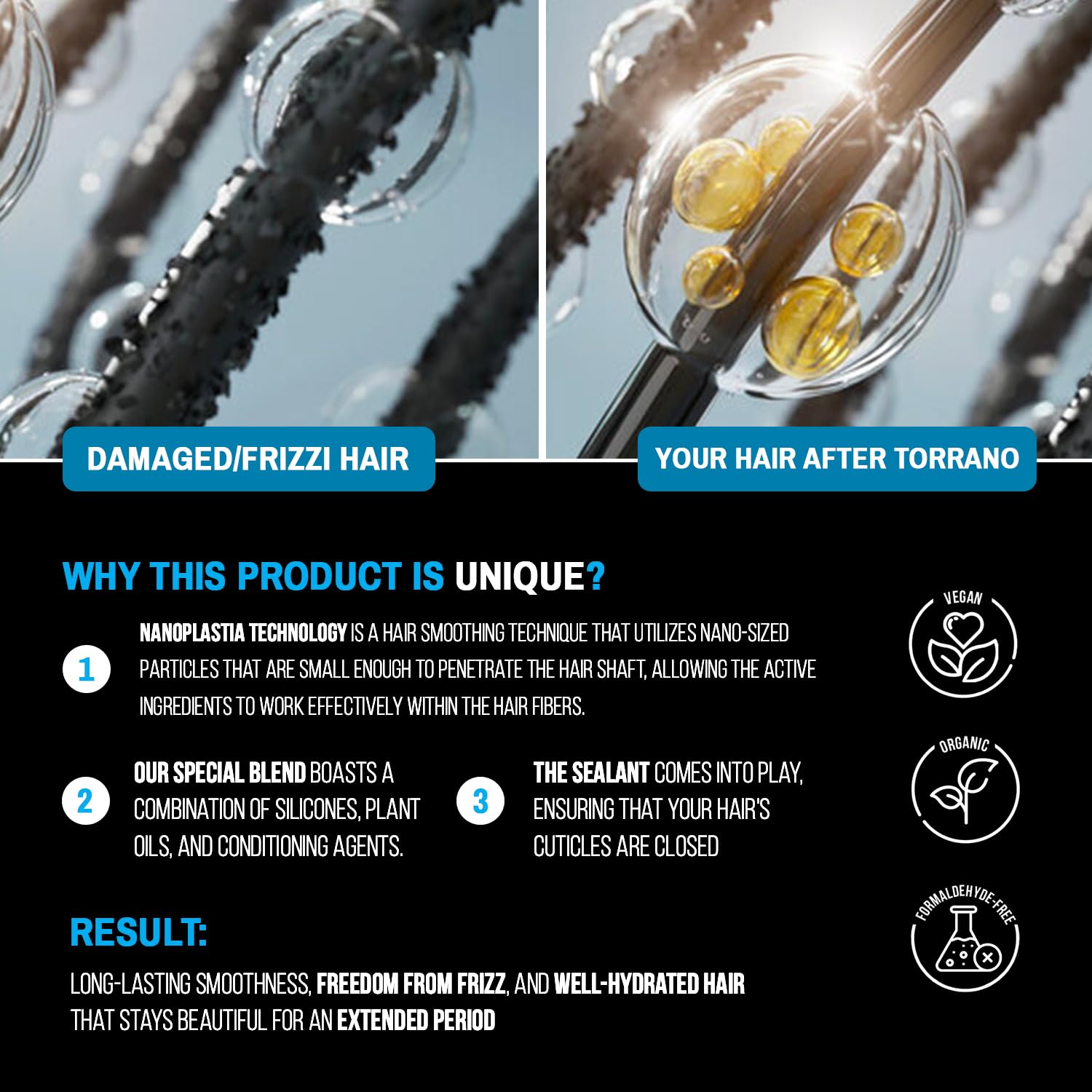 - NANO-STRAIGHTENING IN ONE STEP: Torrano Keratin's has an advanced nanotechnology with an exclusive blend of ingredients. The Tamarind Extract, a healthy active ingredient, works on the hair cortex, enhancing strand flexibility for a beautifully straight shape while the Grape Seed extract creates a protective film, sealing cuticles, controlling frizz, hydrating hair, and reducing volume.
