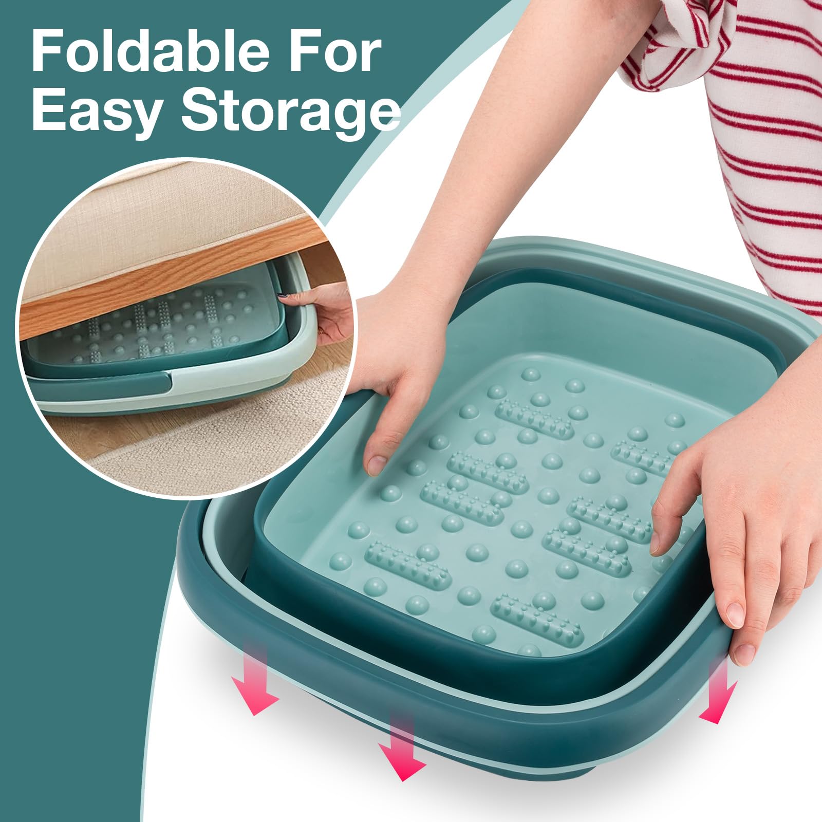 - 【Enjoy the Foot Soak Moment 】-- Our Portable Feet Spa Soaking Basin Bucket is Equipped with 8 massage rollers and 54 massage bumps at the bottom for Shiatsu massage. It can effectively rejuvenate you by increasing comfort, and improve your sleeping quality. Besides, the massager at the bottom of the foot soak tub will also help you to clean the dead skin from the soles of your feet.