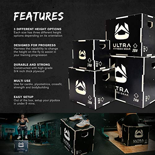 - Built for Plyometrics. Ultra Fitness Gear plyo box features 3 different height options for training flexibility: 24/20/16. Develop strength with our plyometric box at home or the garage gym through squat, step up, dip, box jump training & more