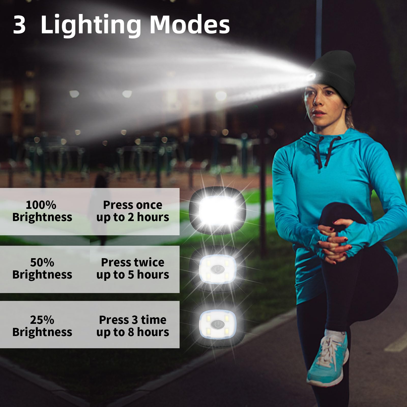 Beanies with LED Light Gifts for Men Women and Adults - Rock Your Style with a Flash Light! Combination of fashion and function Material: 100% acrylic soft, warm, lightweight, comfortable 3 lights modes, 120 lumens super bright USB Rechargeable, No batteries/ Charging cables needed One size fits Most Charging time: approx 1.5- 2 hours Working Time: 2-8H The LED light can be easily removed Can be either hand or machine-washed (Remove the LED light before washing) Ideal for camping, hiking, fishing, cycling, running etc