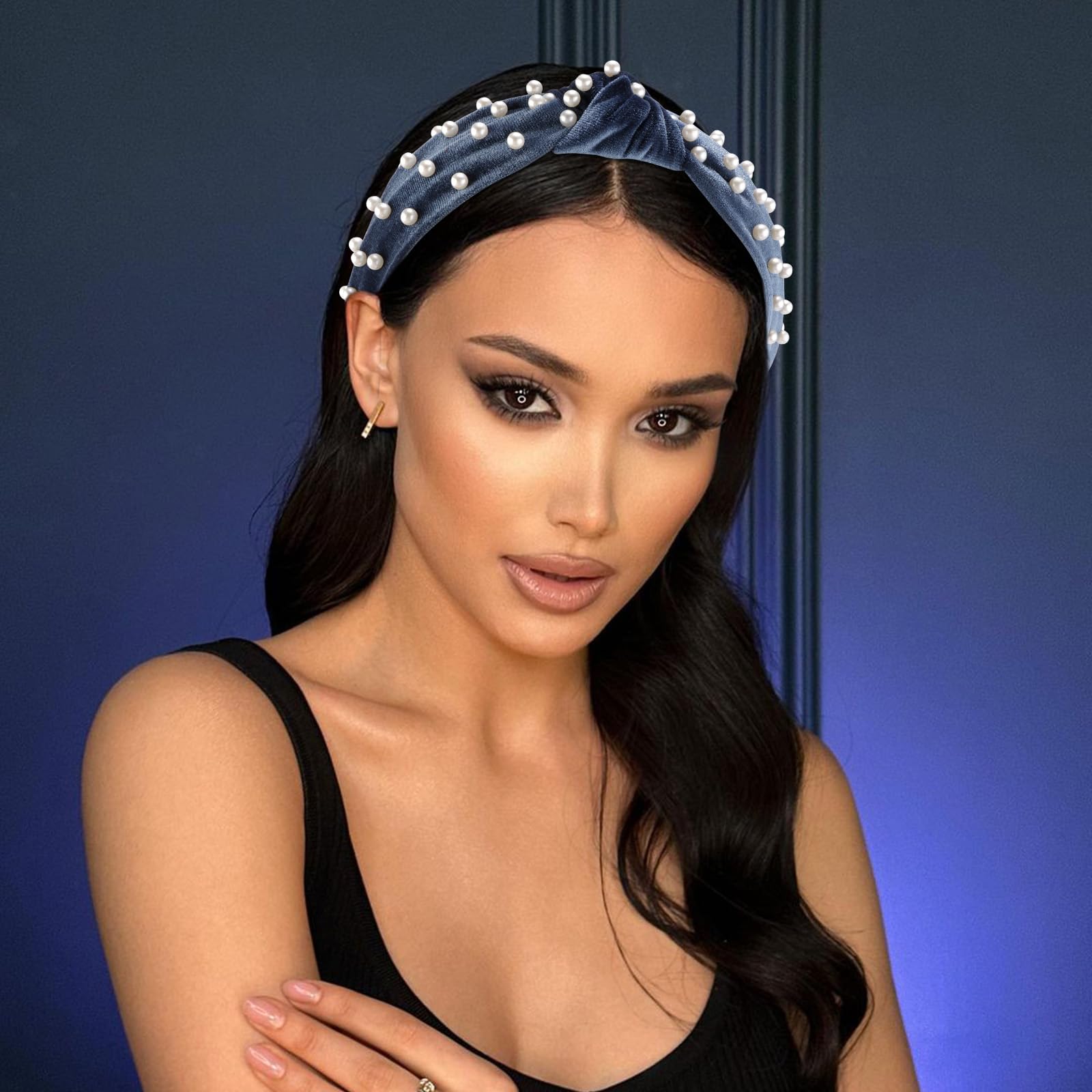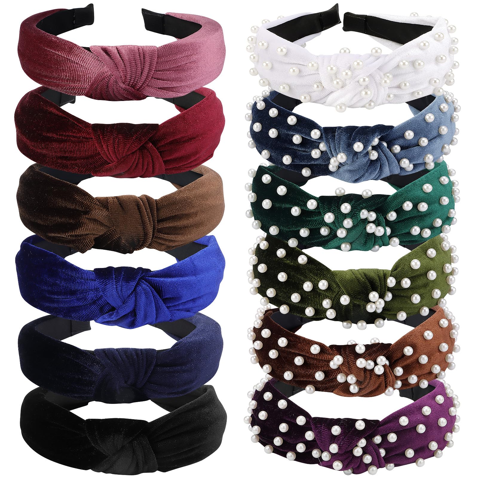 VELSCRUN Pearl Headband, 12 pcs Knotted Headbands for Women - Hair Bands with Beaded Non Slip Wide Top Knot - Velvet Hair Bands for Women's Hair Accessories for Women Girls Gifts, Black White Pink Red