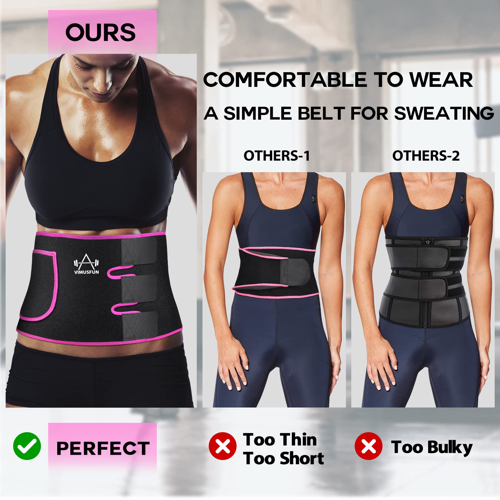 Details: Why you should choose VIMUSFUN Waist Trainer for Women and Man? Whether you're looking to sweat more while you workout, relieve some minor pain or enhance your exercise efforts, this waist trimmer is an ideal choice. ►► Three strong velcro straps so you can have it tighter or looser in certain areas! Stays put even through vigorous workouts. ►► NO Steel Boned, NO Zipper, Super Soft and Flexible of the Fabric! Comfortable to wear and fits well, it really holds your stomach in and the edges don’t cut into your skin. ►► 100% high-quality latex-free neoprene, breathable, lightweight, and flexible, no one will know that you're wearing a sweat vest, even you barely notice it! ►► The waist trimmer cushions compress and support your lower back and abdominal muscles while retaining therapeutic heat, making you sweat buckets! ►► Sweat like crazy, boost your workouts with sweating. ►► Our sweat belts work as functional corsets shapewear, sunna suits, ideal for waist reduction,posture improvement,thermal activity,relief chronic low back pain, providing compression and support for after pregnancy, postpartum recovery or post abdominal surgery,c section, abdominal strains, and weakness, tummy trainer. WARNING: 1. Wash the workout waist shaper belt before your first wearing. 2. Avoid the waist trimmer if you're susceptible to dermatitis or have an allergy to neoprene. Or wear it over a light tank top. 2. Give a few days to adapt to the sweet swear waiter trimmer if you are a newbie. 3. Avoid ripping the sweatband apart, do not put it in a washing machine or dryer. A quick hand wash with mild soap and clean water and hang dry. 4. Every rubbery product smells when it's new. It goes away after a week of being exposed to air.