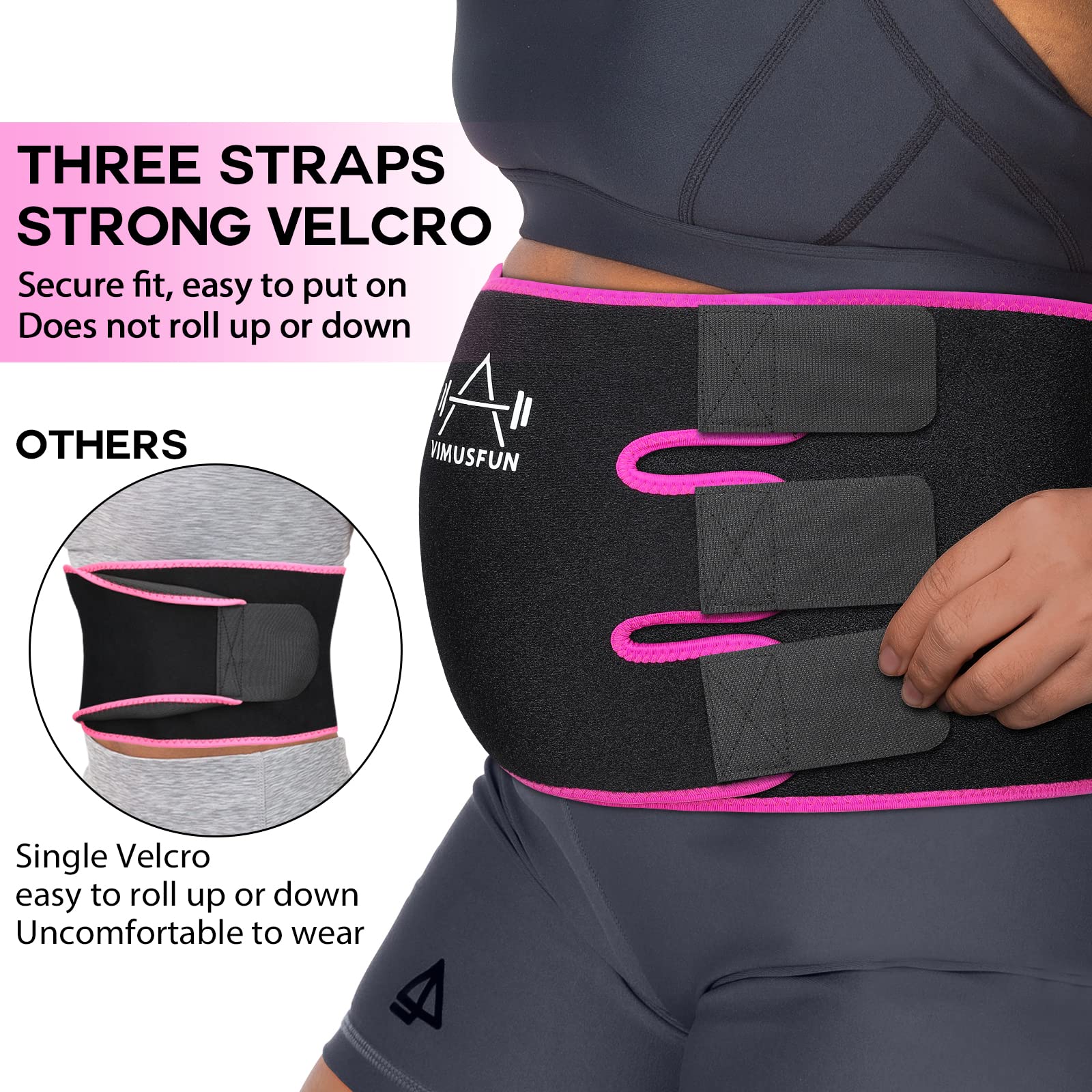 - Three Velcro Straps, Won't Roll Up or Down: Our sweat band has the unique design of three strong velcros, so you can wrap it tighter or looser in certain areas! The entire surface of the waist trainer can be used to attach the velcro, which allows you to easily tighten and secure the belt, stay put even through vigorous workouts. Unlike the other's brand sweat belts which have single velcro, the velcro doesn't stay attached well, always rolling up and down on the sides and being uncomfortable.