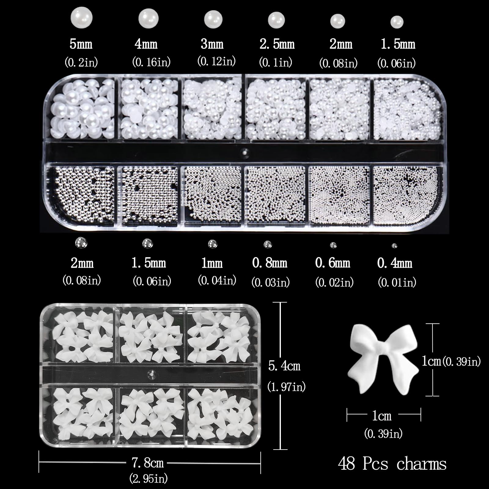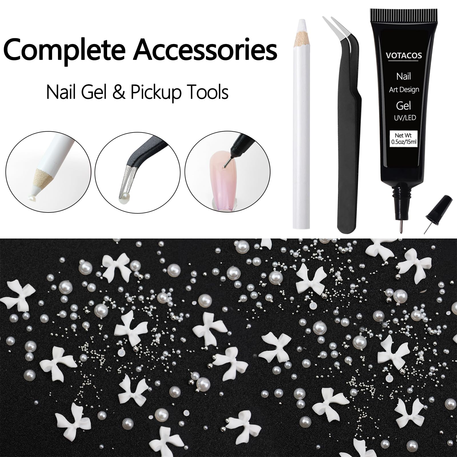 VOTACOS Nail Art Charms White Bow Nail Rhinestones with Nail Glue Gel Flatback Pearls Nail Gems Luxurious Nail Supplies Accessories White Silver Nail Jewelry Pearls for Women Nail DIY Design