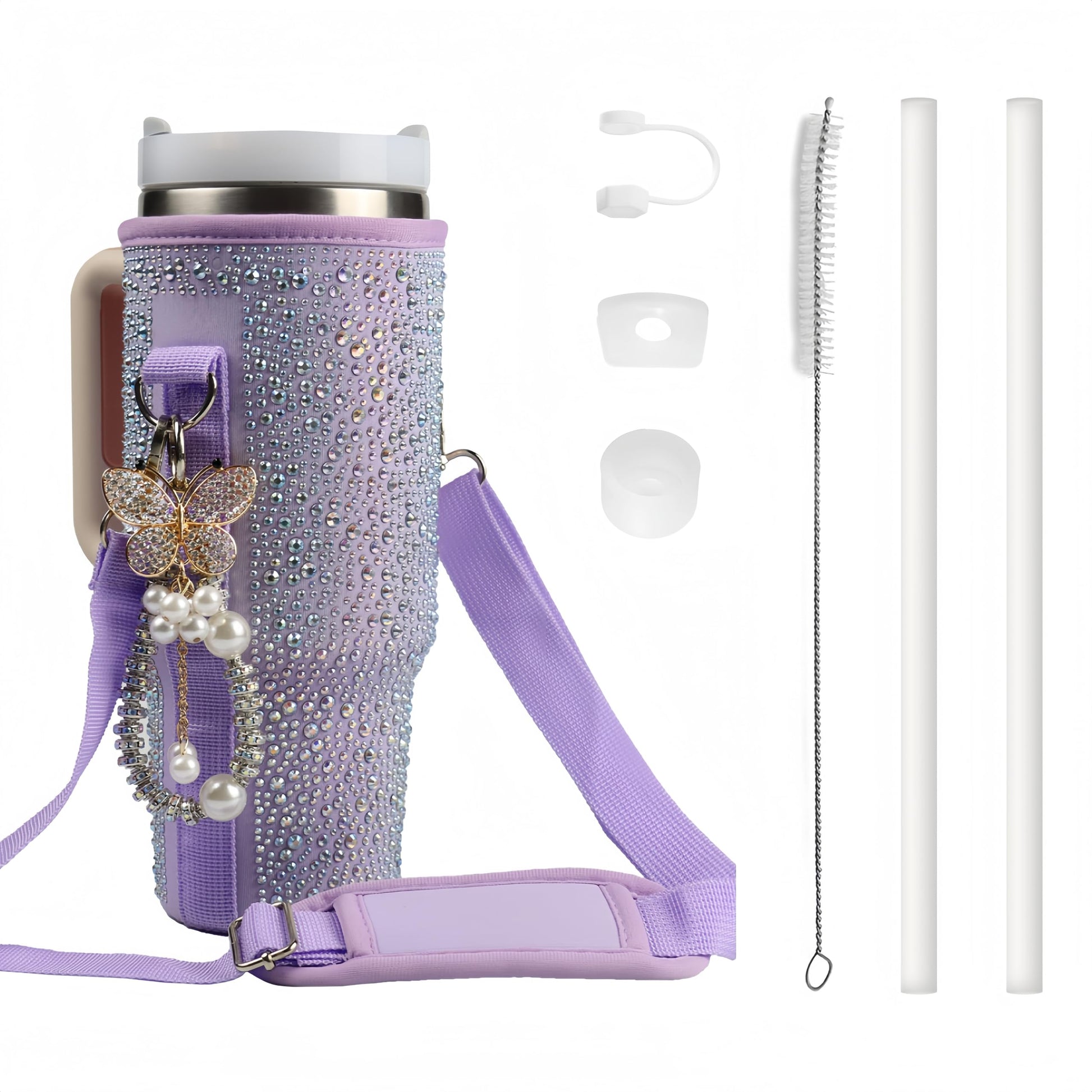 - 【Thoughtful Gift Packaging】 Every accessory is thoughtfully arranged in an elegant gift bag. You will receive a water bottle carrier, 2 straws, 1 brush, 1 set of silicone splash guards, and 1 straw sleeve. We've specially prepared a crystal butterfly pendant and a pearl bracelet, all perfectly tailored for Stanley accessories 40 oz . It's a delightful gift for family and friends.