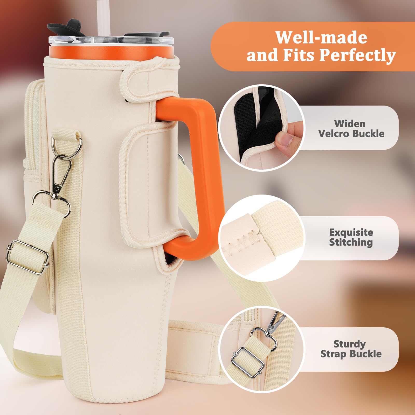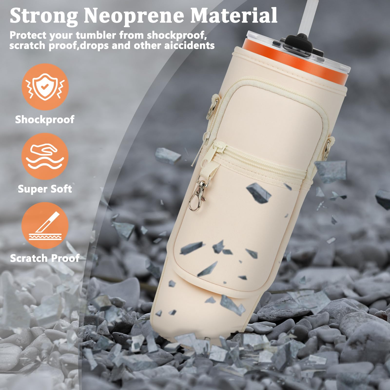Details: Water Bottle Carrier Bag with Phone Pocket Compatible for Stanley/Meoky 40 oz Tumbler with Handle,Neoprene Water Bottle Holder Pouch with Adjustable Strap Compatible for Stanley Cup Accessories