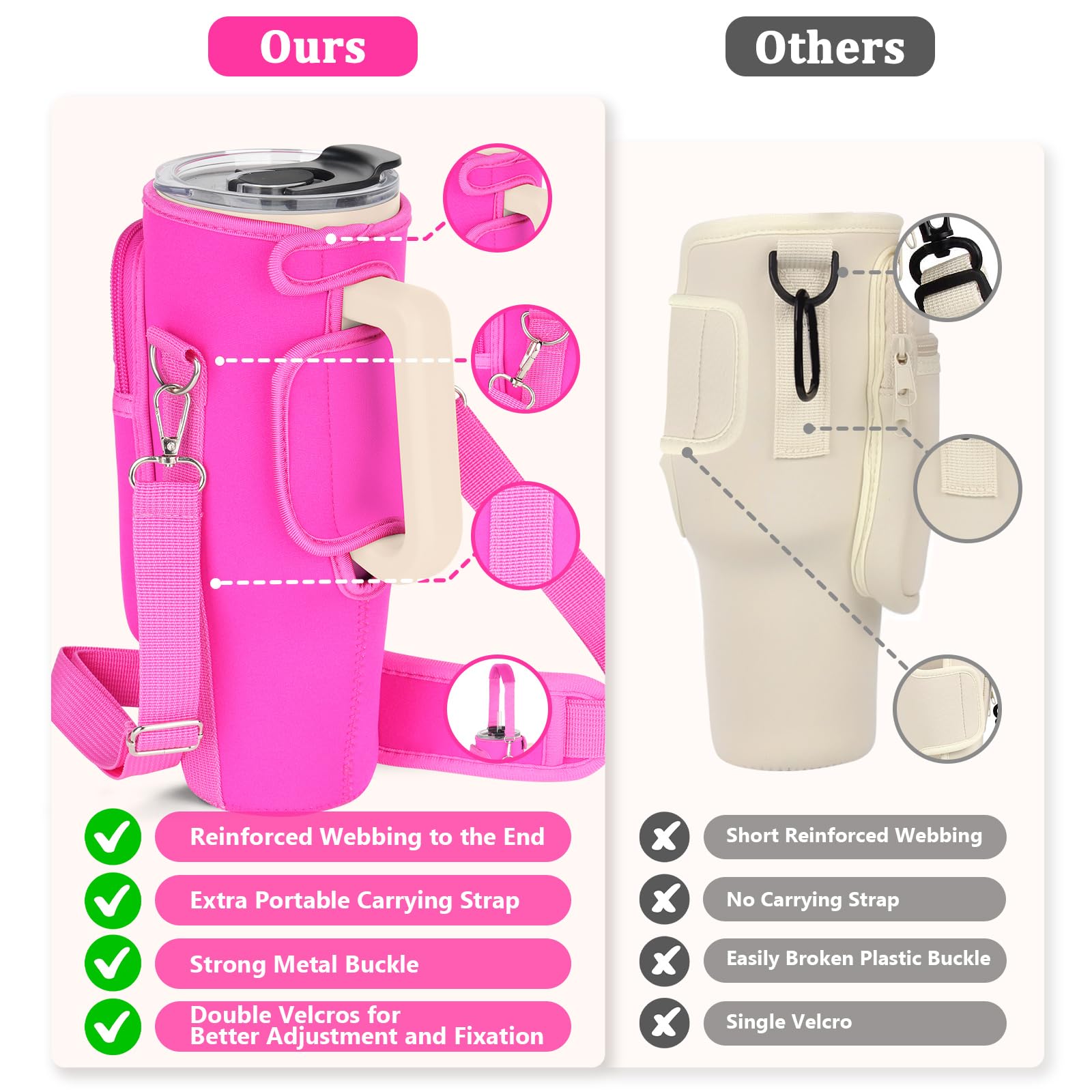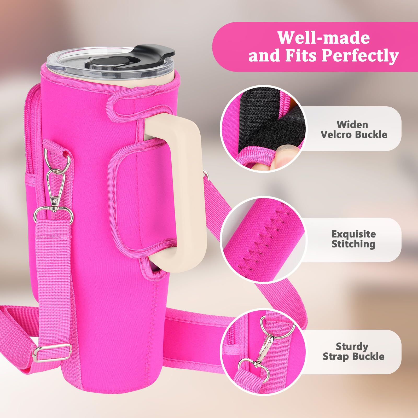 Details: Water Bottle Carrier Bag with Phone Pocket Compatible for Stanley/Meoky/Simple Modern/BrüMate 40 oz Tumbler with Handle,Neoprene Water Bottle Holder Pouch with Adjustable Strap Compatible for Stanley Cup Accessories,Rose Red