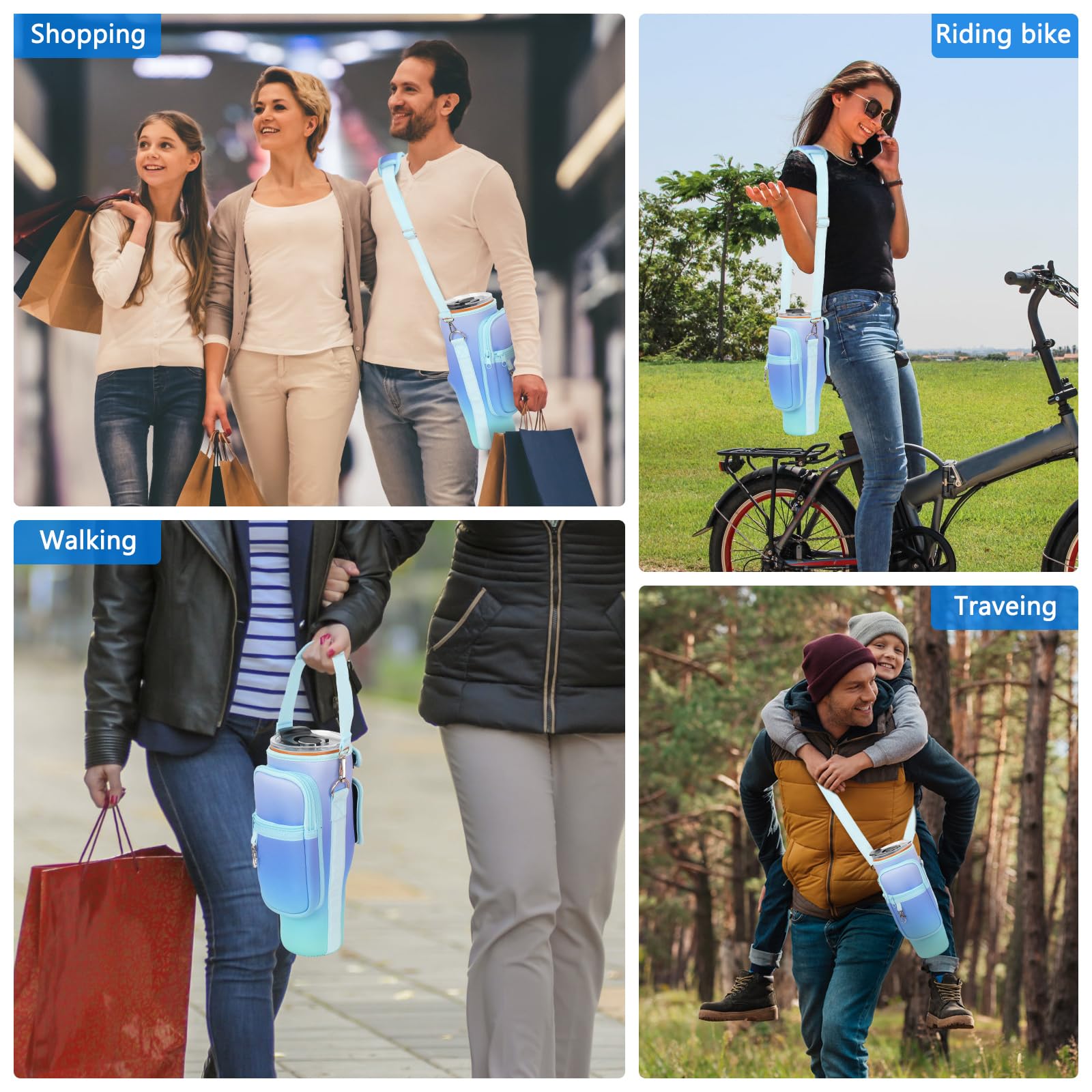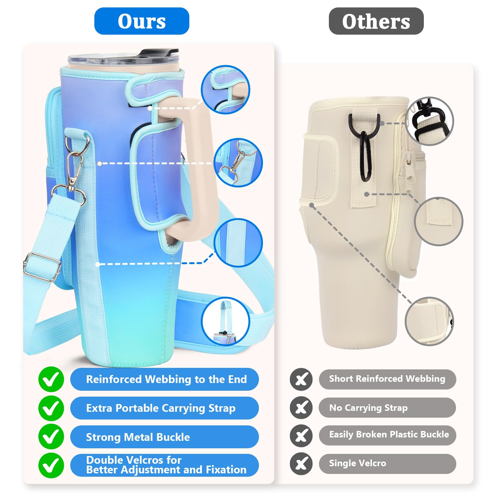 Details: Water Bottle Carrier Bag with Phone Pocket Compatible for Stanley/Meoky/Simple Modern/BrüMate 40 oz Tumbler with Handle,Neoprene Water Bottle Holder Pouch with Adjustable Strap Compatible for Stanley Cup Accessories,Blue-Purple