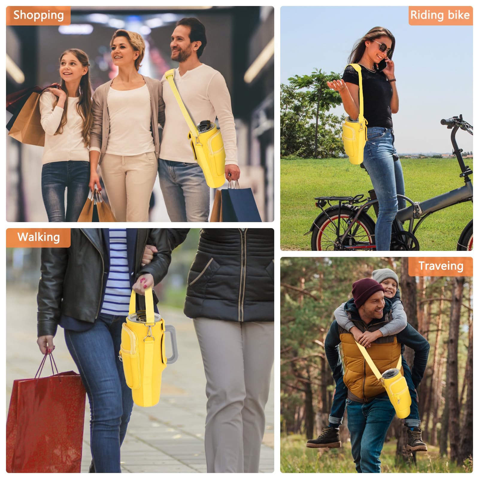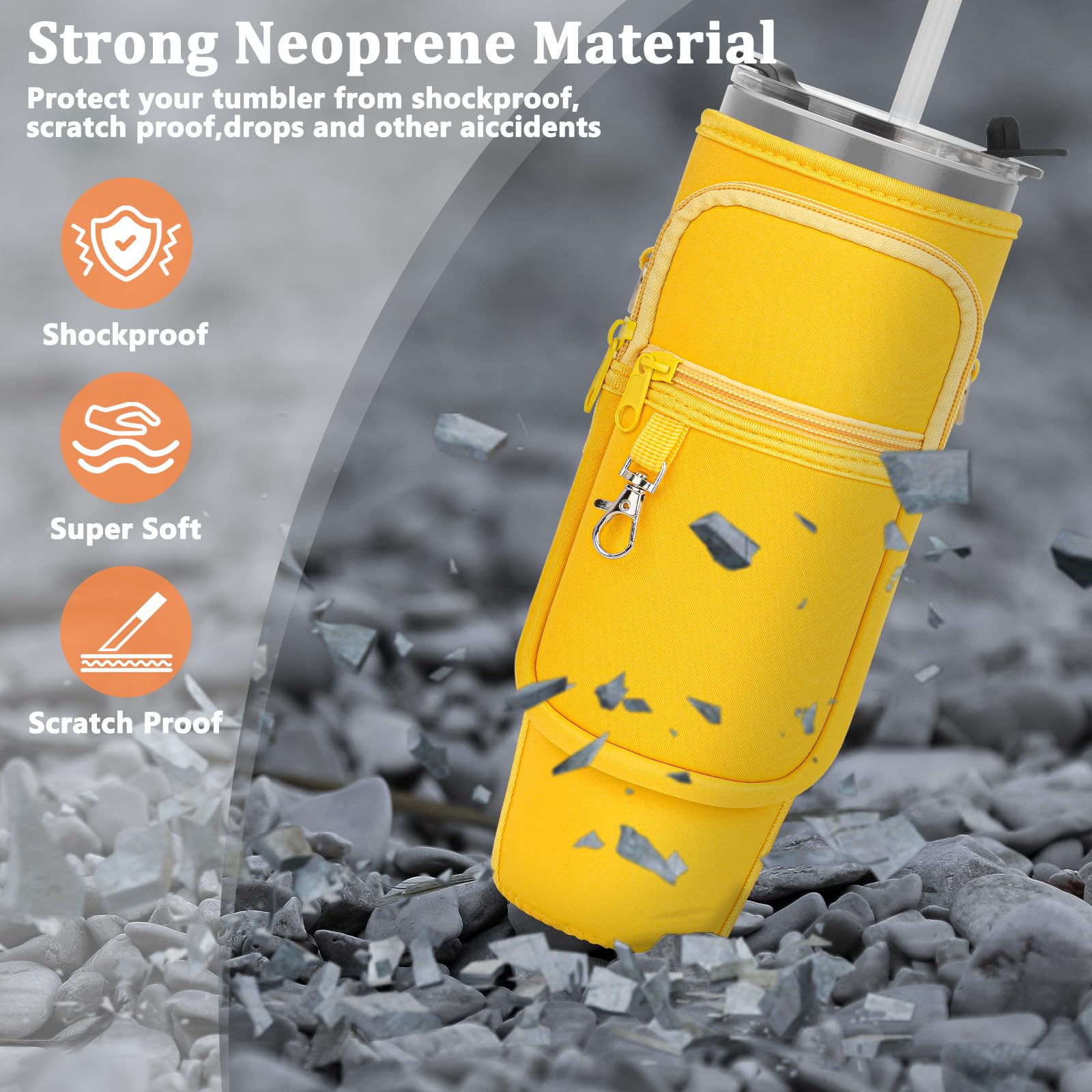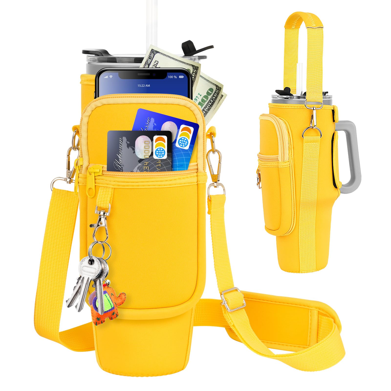 Details: Water Bottle Carrier Bag with Phone Pocket Compatible for Stanley/Meoky 40 oz Tumbler with Handle,Neoprene Water Bottle Holder Pouch with Adjustable Strap Compatible for Stanley Cup Accessories,Yellow