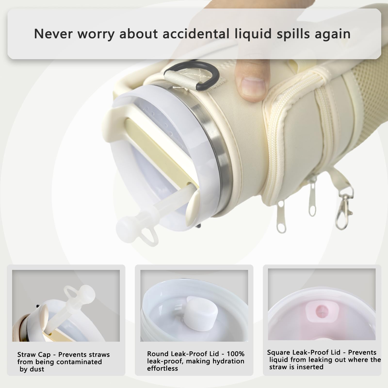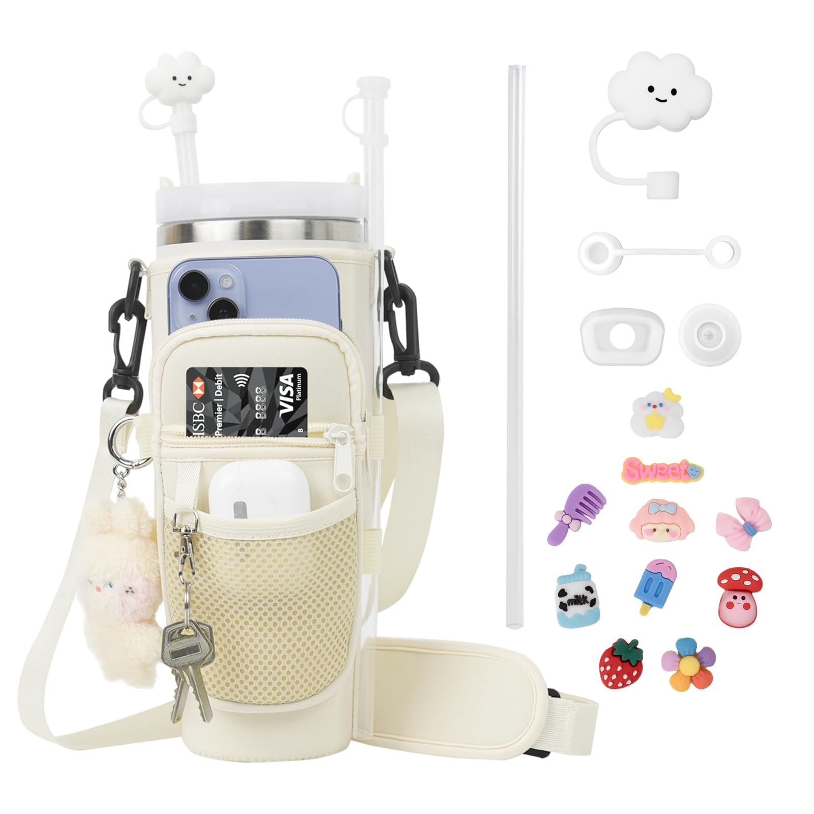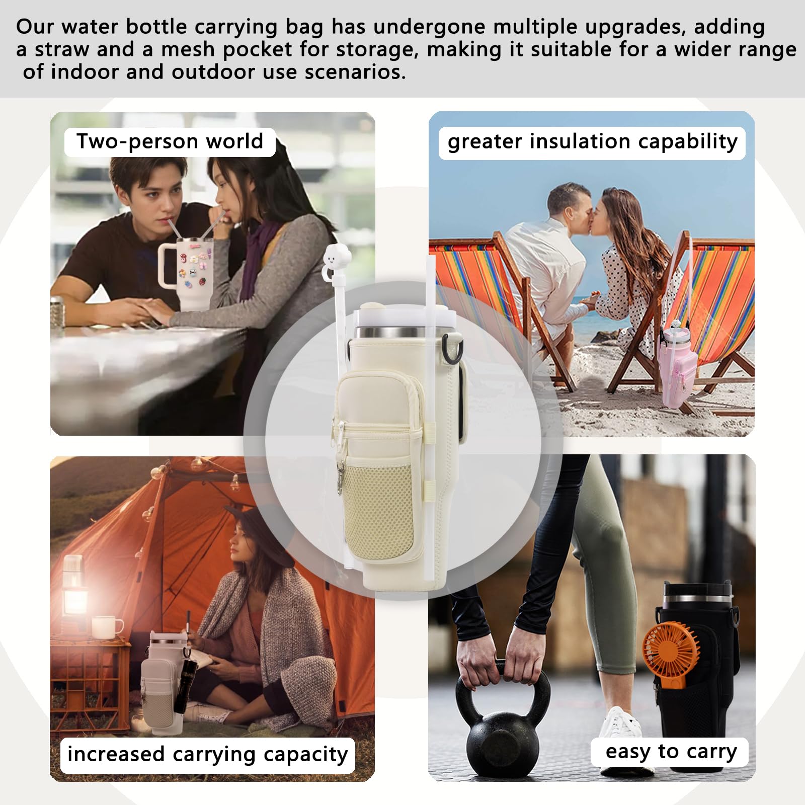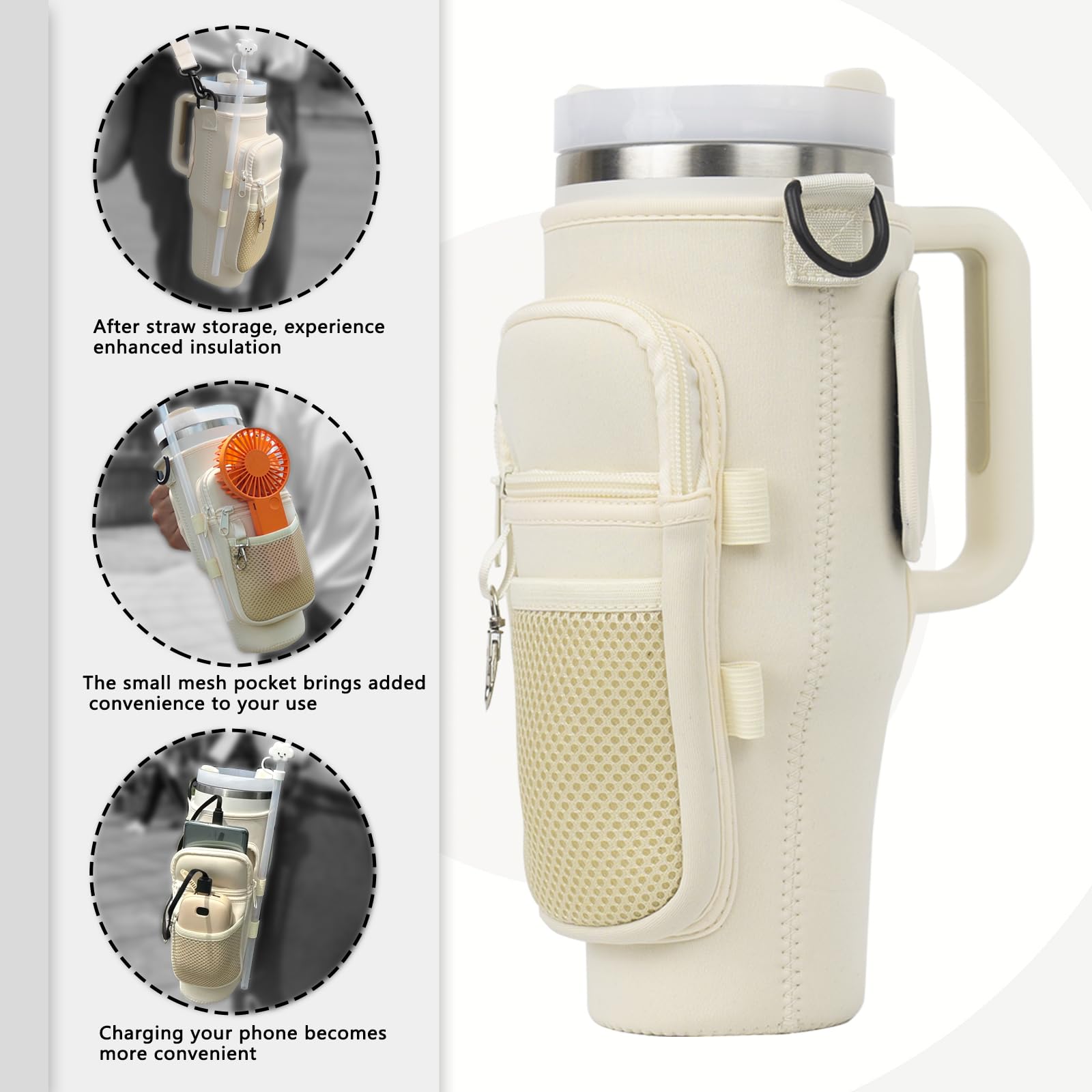Water Bottle Carrier Bag with Phone Pocket for Stanley 40 oz Tumbler Neoprene Water Bottle Holder Pouch with Straw Toppers with Elastic Band for Holding Straws for Stanley Cup Accessories (Cream)