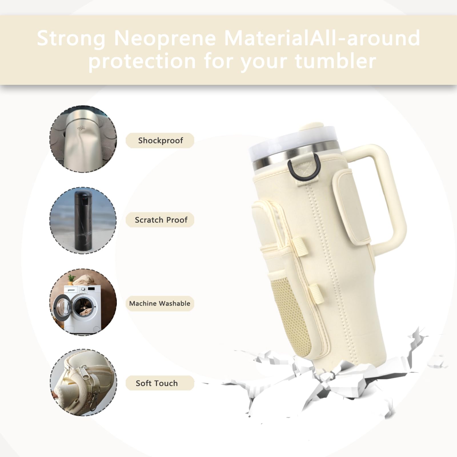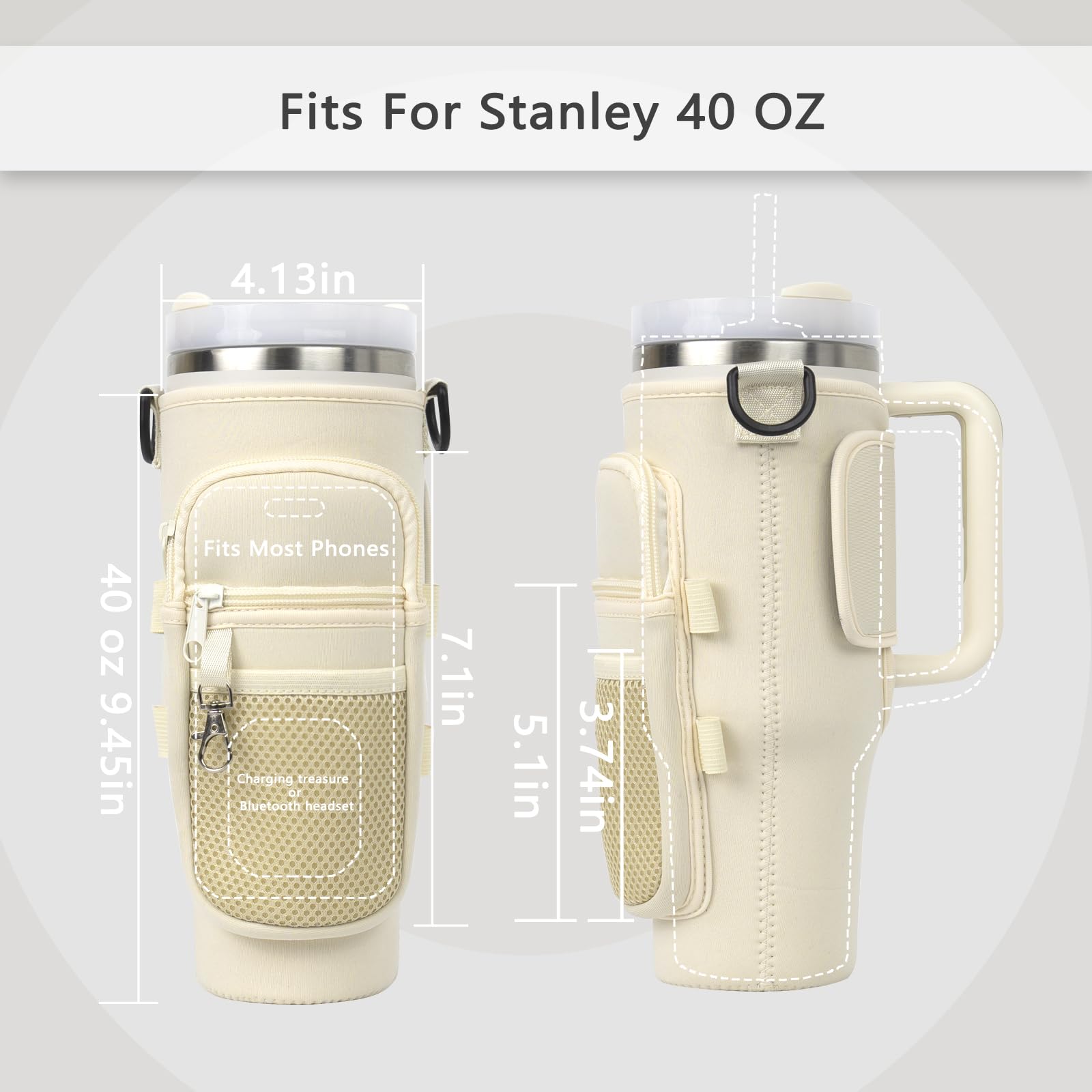 - š„¤ćPerfect for Stanley 40oz Tumbler with Handlećlhonnetete cream water bottle holder with strap is specially designed for Stanley Quencher H2.0 40 oz and for Stanley Adventure Quencher 40 oz. For stanley accessories 40 OZ provide a snug fit and features fine stitching, making your tumbler pouch even more stylish. The snug fit of the cup makes it easy to keep your for starbucks stanley cup in your car cup holder.