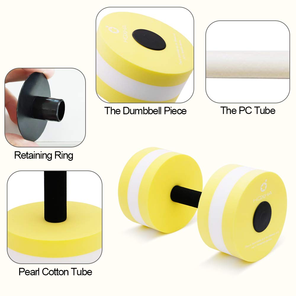 - HIGH QUALITY FOAM & COMFORTABLE GRIP - HOXHA aquatic dumbells are made of high quality EVA material, tasteless and waterproof, the resistance of the barbells will provide an overall workout for your upper body, lower back and other parts.