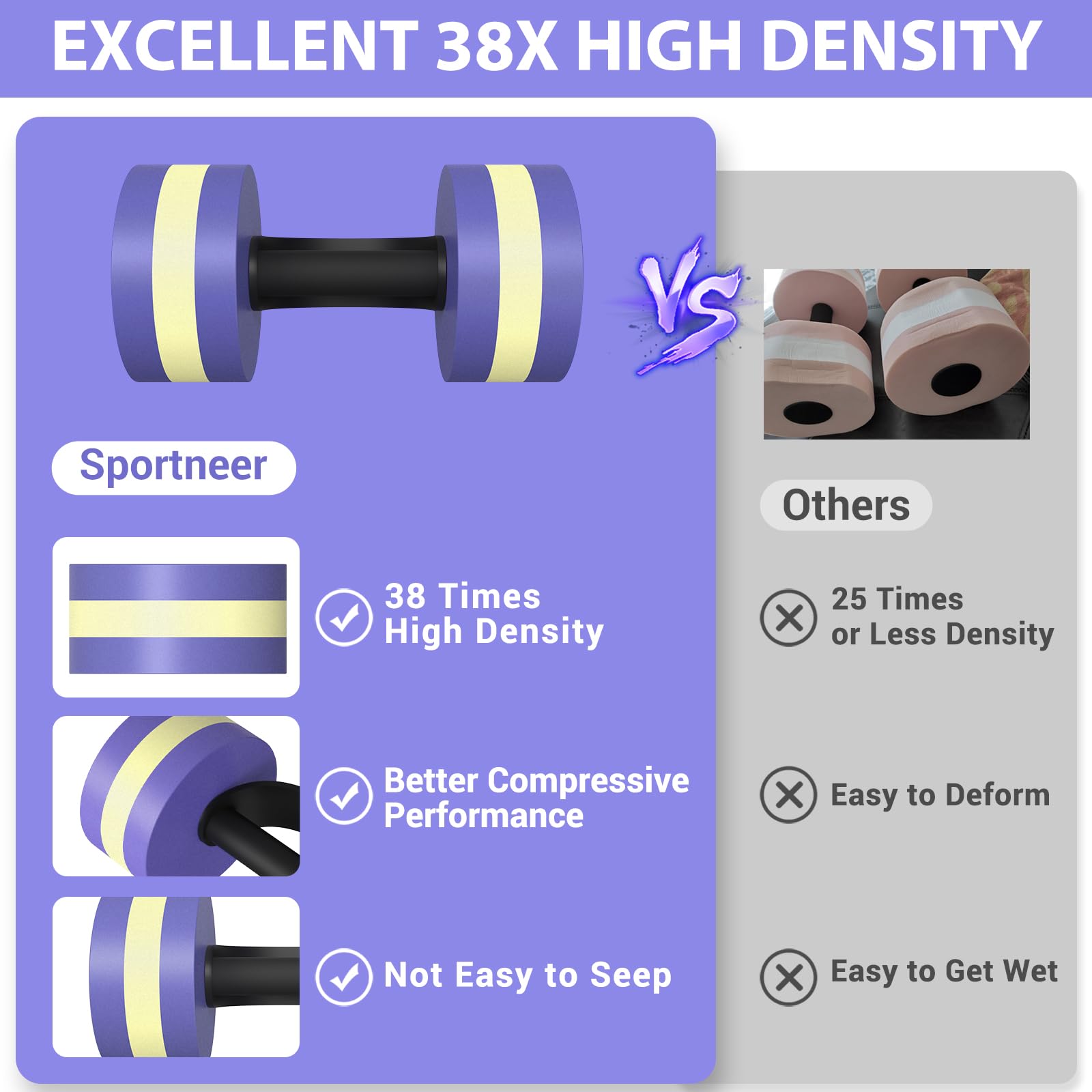 - 38 Times High-Density Material: Compared with other water dumbbells on the market, the Sportneer water weight made of high-quality, 38 times high-density EVA foam materials are durable, safe, environmentally friendly, waterproof, odorless, and quick-drying.
