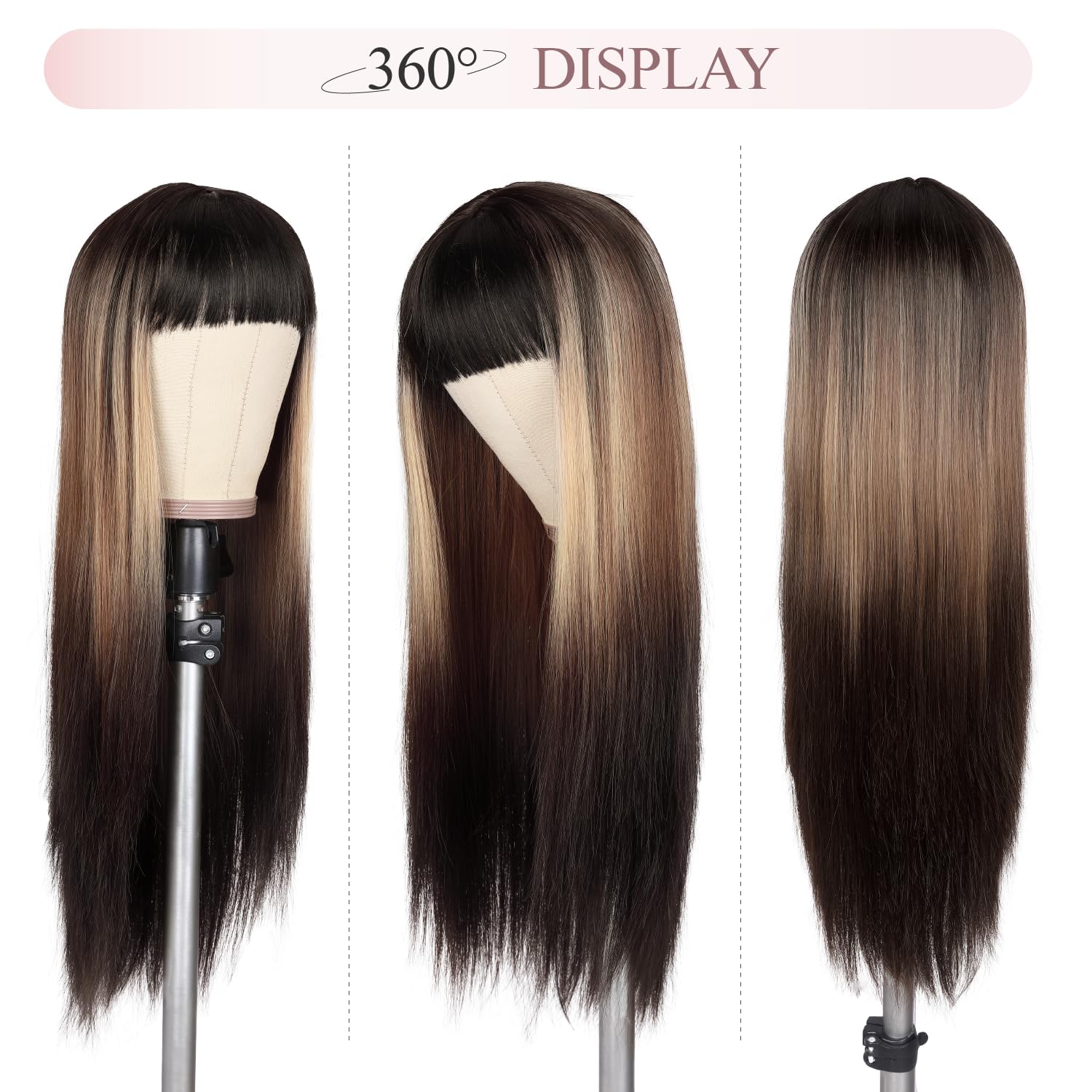 - HAIR WIG STYLE: The brown straight hair wigs looks like real hair and more natural to wear. It is three-tone wig, natural transition from black to blonde to brown. Hair bangs can’t only cover some hair loss and add more hair volume but also modify the face perfectly.