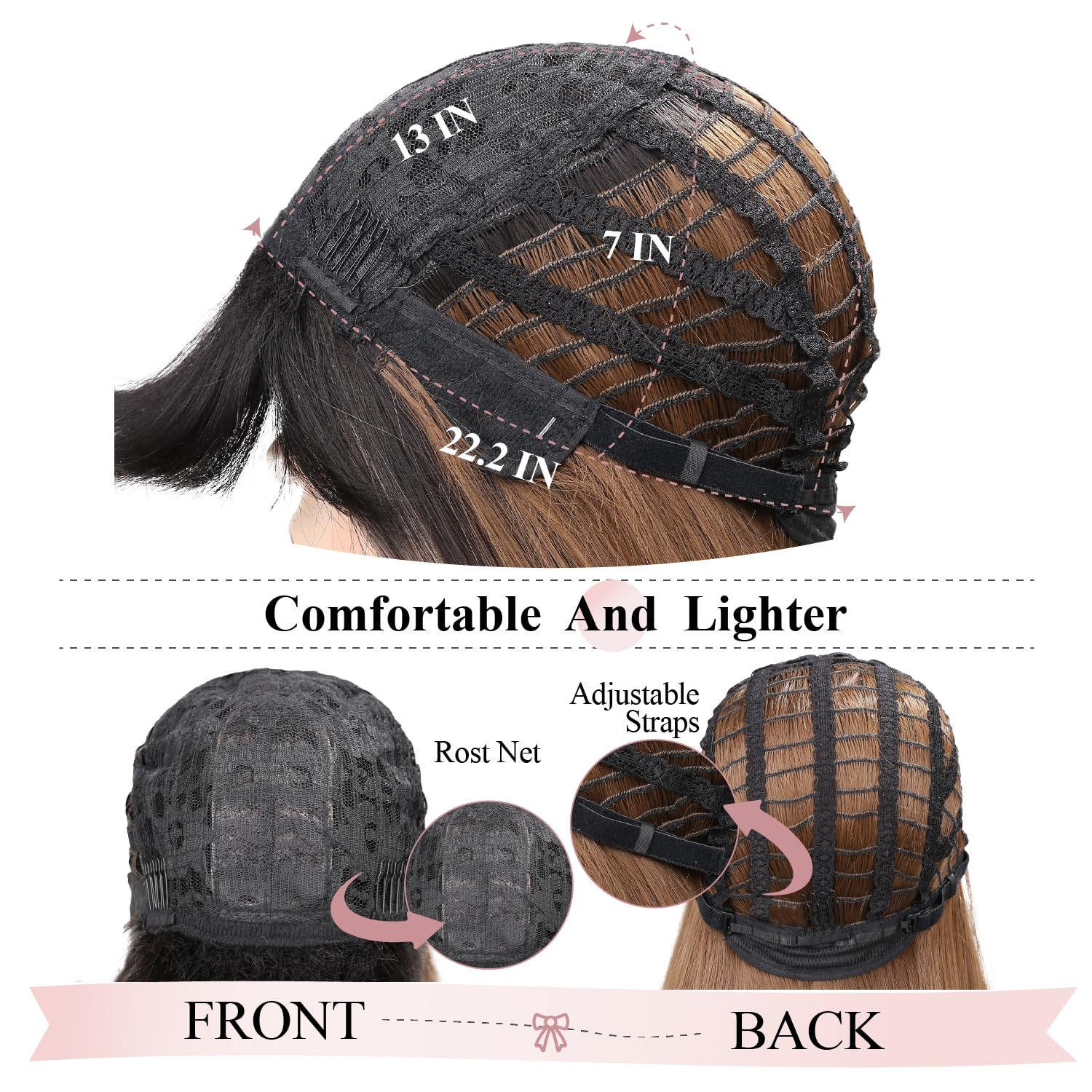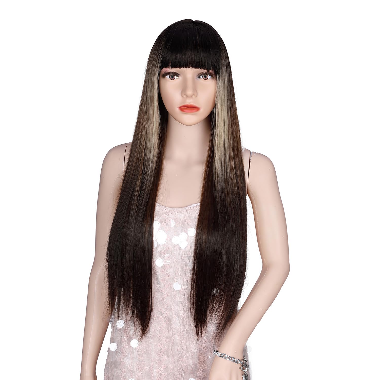 - HAIR WIG FEATURES: The straight ombre brown-blonde long wig is black at the hair top, has a natural transition to blonde to brown color. Hair length is 28 inch, hair weighs is about 265 gram. This ladies straight bangs wig has 3 combs to secure and high quality rose net cap, more breathable and comfortable. Circumference is 21.5-22.5 Inch stretched medium cap, the inner cap net is with two adjustable straps, suitable for most people head size.