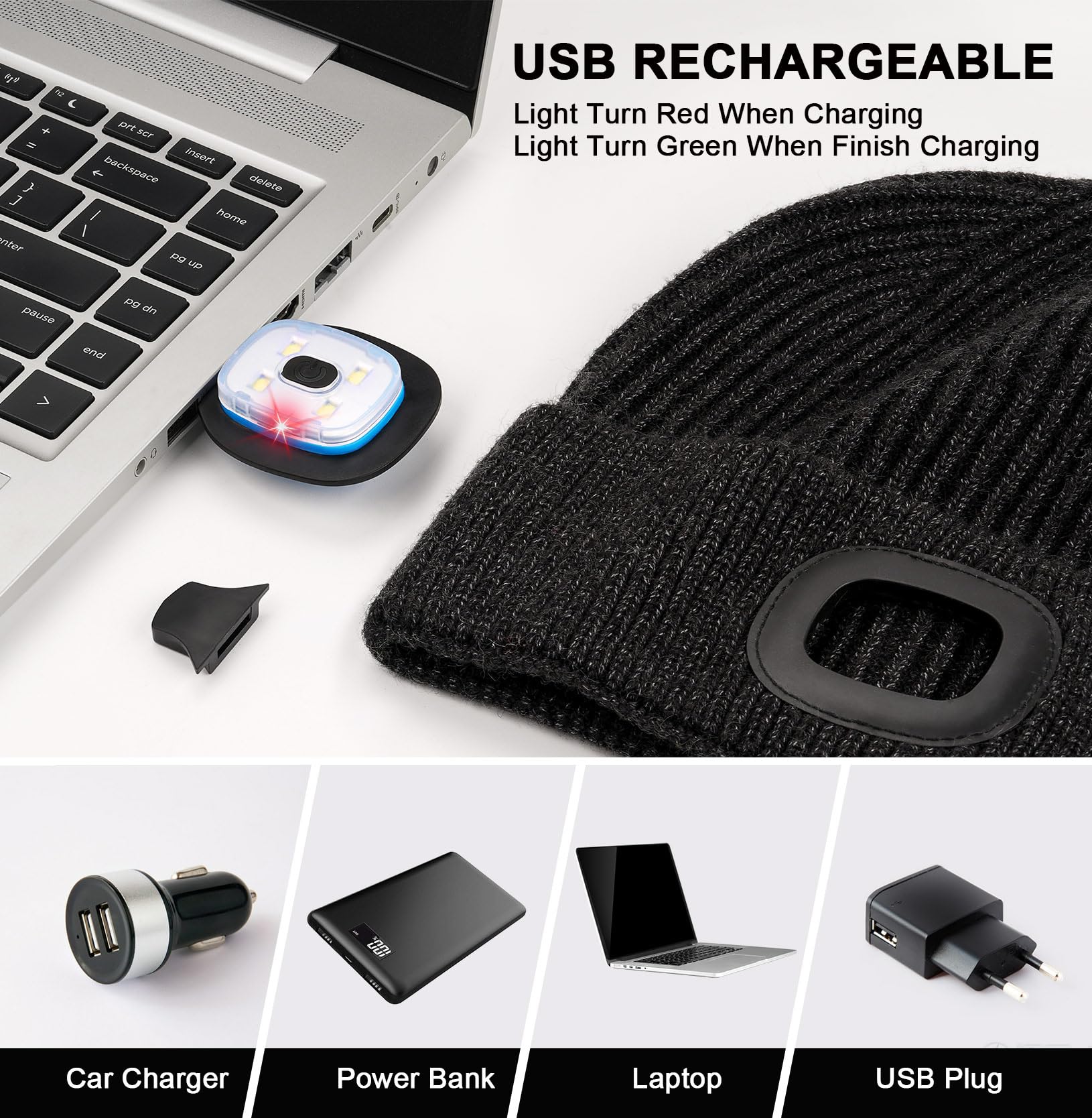 - 【USB Rechargeable Caps】Beanie with rechargeable light provides a standard USB port for battery charging, making it easy for you to charge in your car, computer, or portable power bank. No longer requires purchasing or using other batteries, nor does it require additional charging cables.