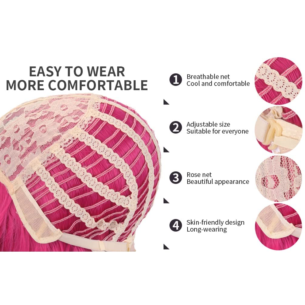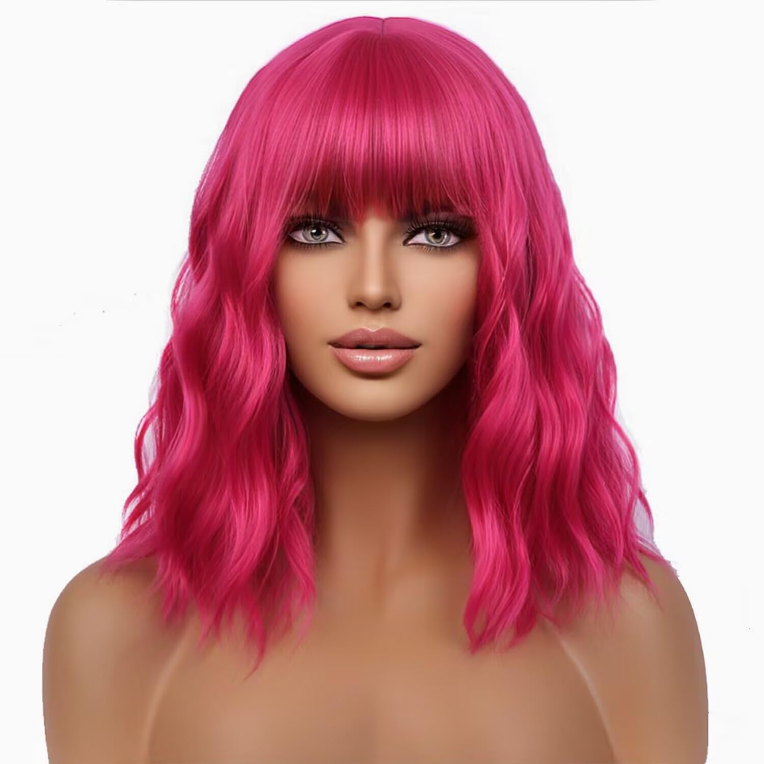 WTHCOS Hot Pink Wig Short Curly Wavy Wig with Bangs Rose Red Wig for Women Magenta Wig Neon Pink Wig Synthetic Wigs for Cosplay Costume Party with Wig Cap