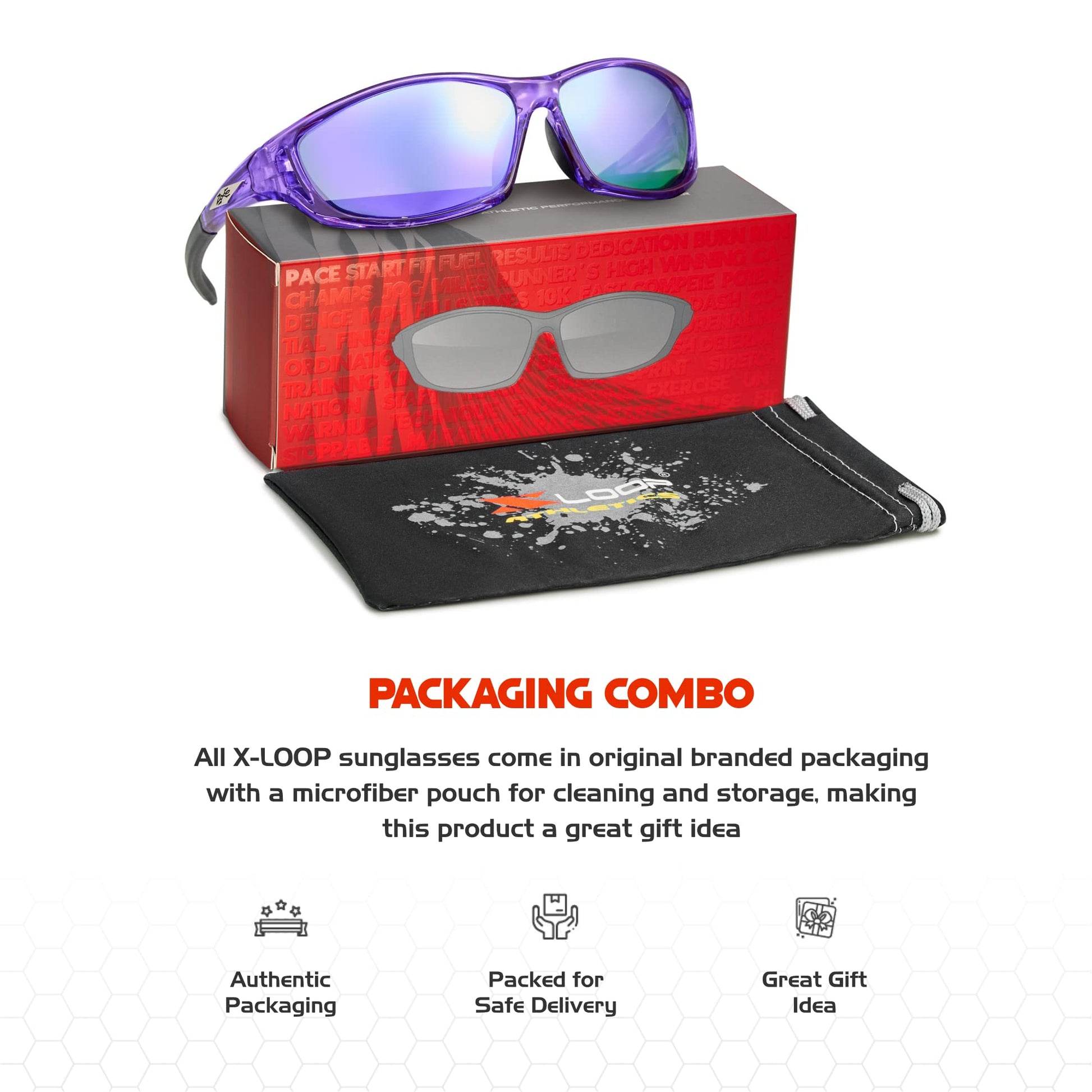 Details: Why Choose X Loop Polarized Sunglasses? Here Are The Top 3 Reasons!☑️ ENJOY THE ERGONOMIC DESIGN: The X LOOP wraparound men's sport sunglasses were designed to offer you absolute comfort thanks to the soft rubbers used around the arms and on the nose pads.☑️ 100% UV400 PROTECTION: Our X LOOP sun glasses create the safest environment for your eye by filtering out harmful UV rays. The 1.1mm TAC Polarized Lenses offer a better visual experience and anti glare protection. ☑️ OFFER A THOUGHTFUL GIFT: Stylish and functional, the sunglasses are ideal for everyday men, athletes, travelers, and professionals. Still Skeptical? Additional Features Include✔️ Impact-Resistant Lenses ✔️ Shatterproof Frame ✔️ Vibrant Frame and Lens Colors✔️ REVO coated Color Mirror LensesWhat You Get:1 Pair of X Loop Polarized Sport Sunglasses1 X Loop Athletics Microfiber Pouch1 X Loop Athletics Packaging Box