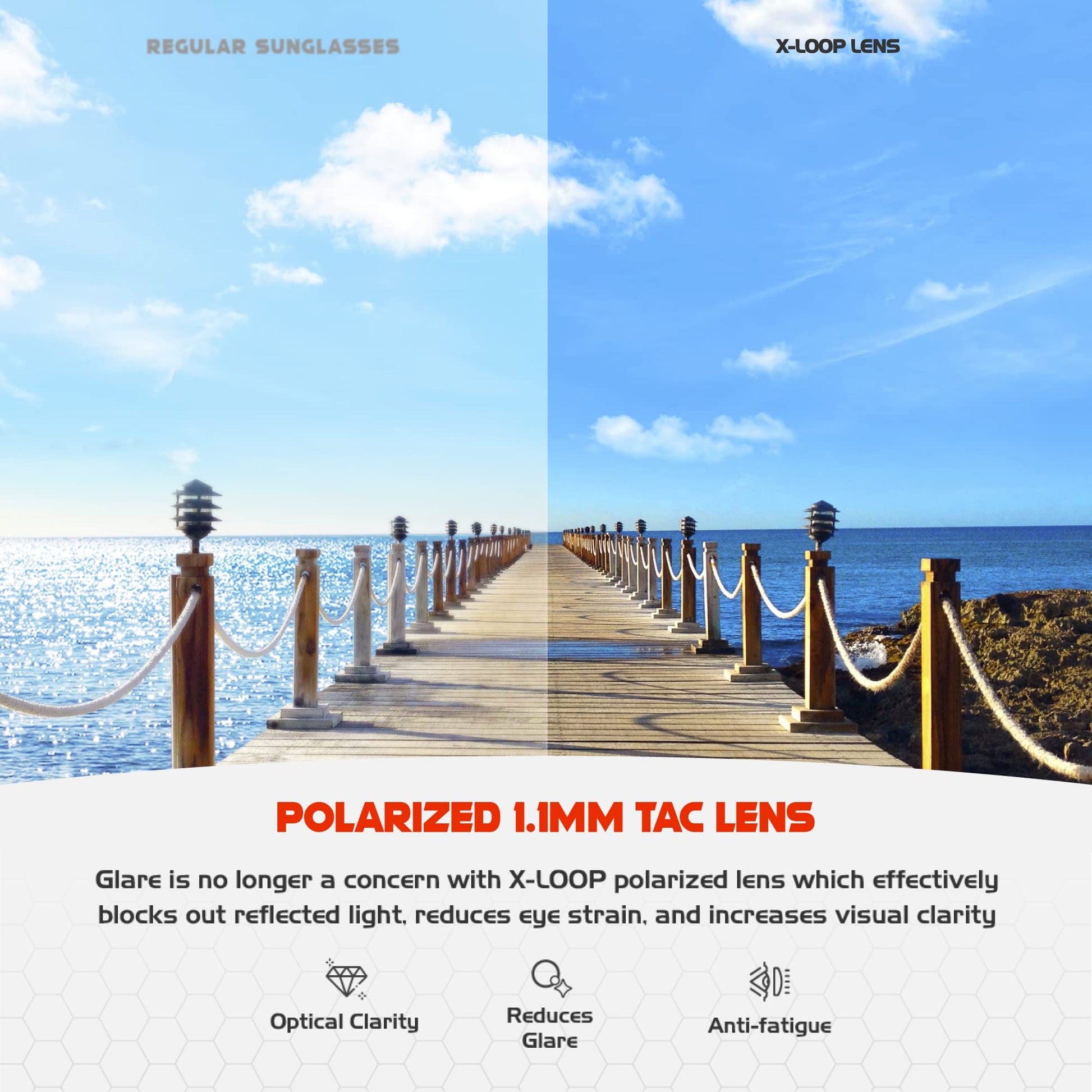 - ✅ 1.1MM TAC POLARIZED LENSES: Protect your eyes and pamper yourself with a more accurate visual experience! The X LOOP polarized sports sunglasses are perfect for all outdoor activities as they eliminate sun glare created by water, pavement and snow.