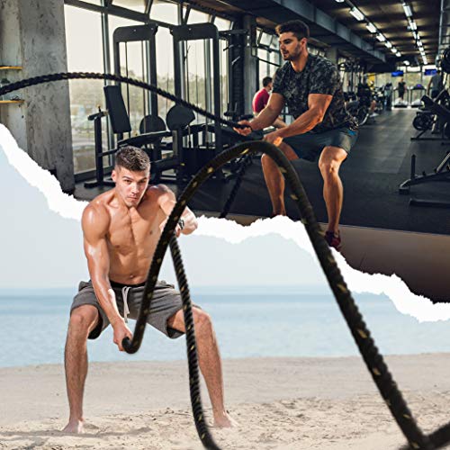 - [PROFESSIONAL BATTLE ROPE WITH ULTRA DURABLE CONSTRUCTION] this battle rope is made of 3-strand twisted 100% Poly Dacron,with a compact structure, strong tensile force, and not easy to loose and deform. This product is an ideal choice for beginners and serious fitness enthusiasts for home gym and outdoor exercises.