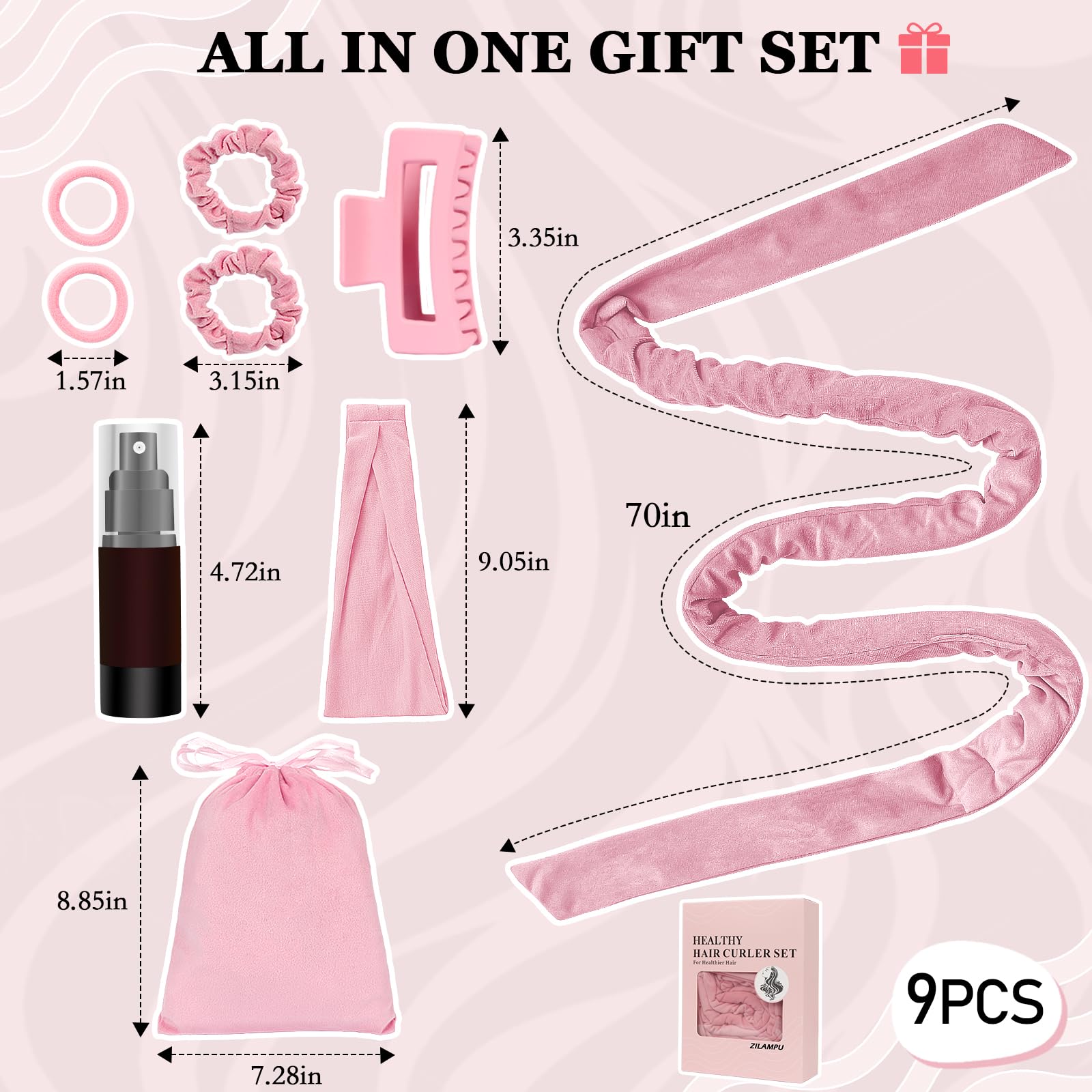 - Perfect Gift: This 9-piece hair curler set includes: 1* 70-inch long curling headband, 2* velour hair ties, 2* elastic hair ties, 1* velour storage bag, 1* hair clip, 1* yoga band, 1* spray bottle. All-In-One set is the perfect gift for family, friends, and colleagues in Christmas, New Year's Day, Birthday, Teacher's Day,Mother's Day,Valentine' Day.