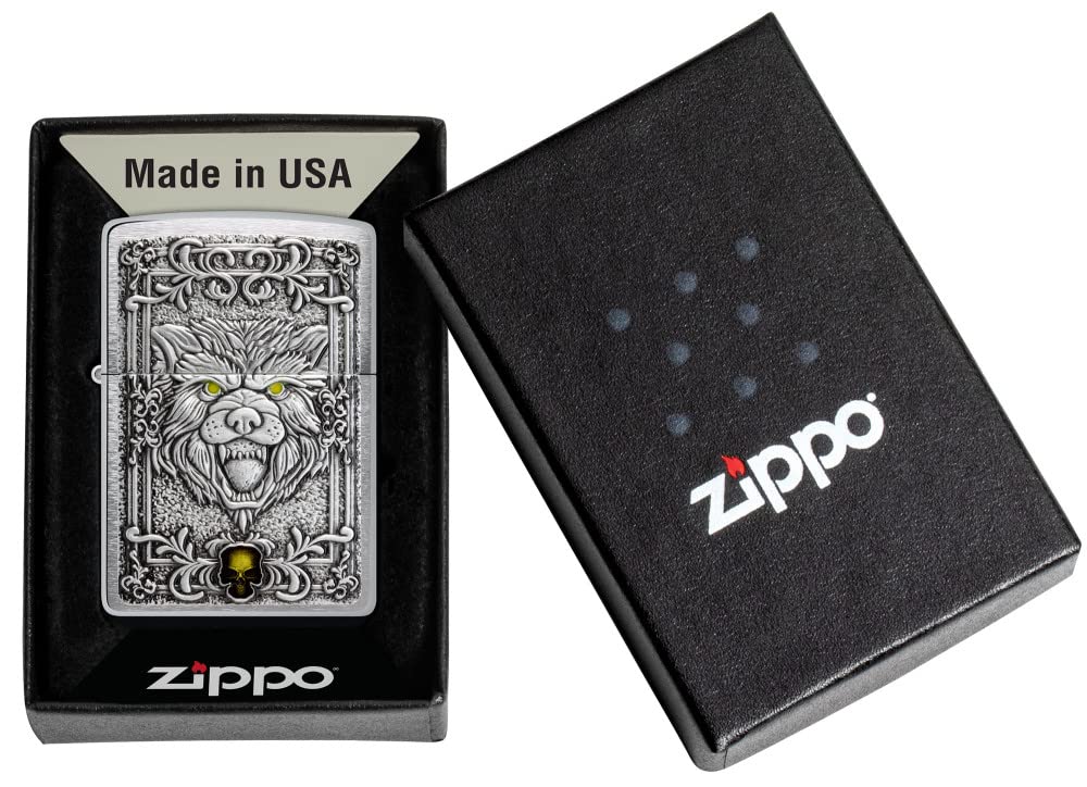 Details: Zippo's wolf lighter collection is a favorite among fans and collectors. The wolf lighters are created using two of Zippo's imprint methods; color image and emblem attachments. These unique designs have been placed on four different lighter cases; Brushed Chrome, Street Chrome, Black Matte, Black Ice, and Spectrum. Each lighter has a bottom stamp signifying the year it was made, is refillable, and is backed by Zippo's famous lifetime guarantee. All windproof lighters are American made in our Bradford, PA factory and come packaged in a gift box.